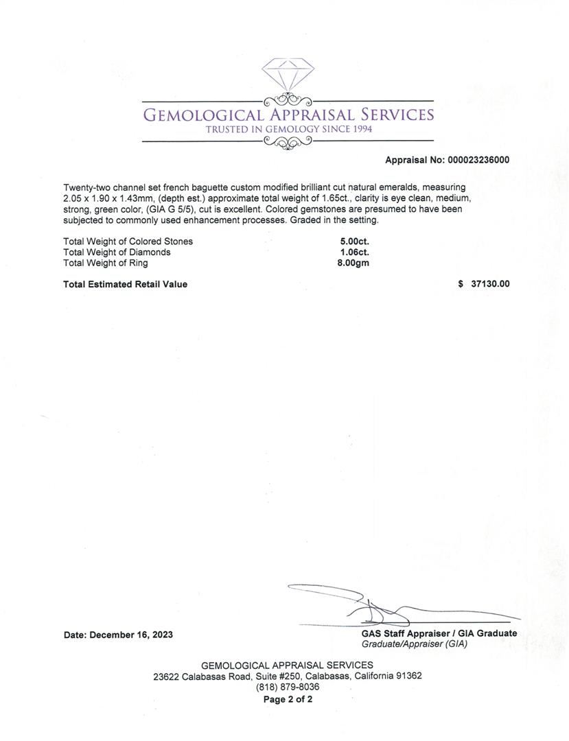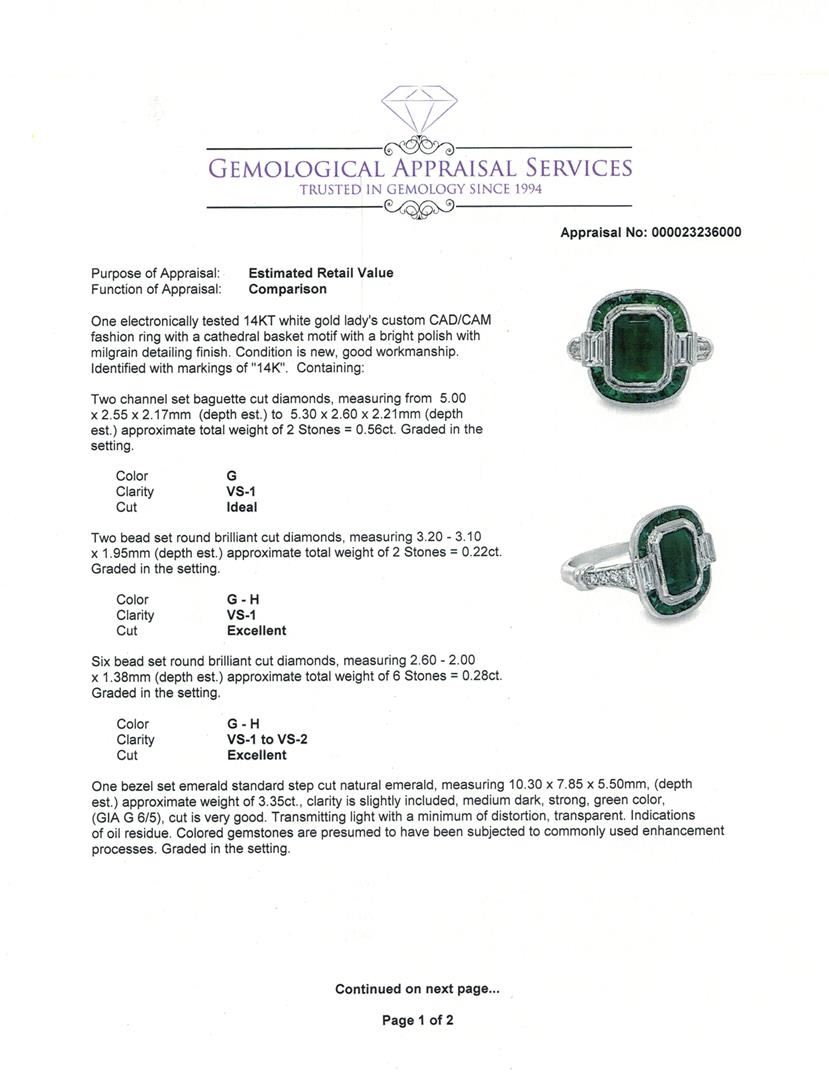 One electronically tested 14KT white gold lady's custom CAD/CAM fashion ring with a cathedral basket motif with a bright polish with migraine detailing finish. Identified with markings of "14K". Condition is new, good workmanship. Containing: Two channel set baguette cut diamonds, measuring from 5.00 x 2.55 x 2.17mm (depth est.) to 5.30 x 2.60 x 2.21mm (depth est.) approximate total weight of 2 Stones = 0.56ct. Graded in the setting. Color G Clarity VS-1 Cut Ideal Two bead set round brilliant cut diamonds, measuring 3.20 - 3.10 x 1.95mm (depth est.) approximate total weight of 2 Stones = 0.22ct. Graded in the setting. Color G - H Clarity VS-1 Cut Excellent Six bead set round brilliant cut diamonds, measuring 2.60 - 2.00 x 1.38mm (depth est.) approximate total weight of 6 Stones = 0.28ct. Graded in the setting. Color G - H Clarity VS-1 to VS-2 Cut Excellent One bezel set emerald standard step cut natural emerald, measuring 10.30 x 7.85 x 5.50mm, (depth est.) approximate weight of 3.35ct., clarity is slightly included, medium dark, strong, green color, (GIA G 6/5), cut is very good. Transmitting light with a minimum of distortion, transparent. Indications of oil residue. Colored gemstones are presumed to have been subjected to commonly used enhancement processes. Graded in the setting. Twenty-two channel set French baguette custom modified brilliant cut natural emeralds, measuring 2.05 x 1.90 x 1.43mm, (depth est.) approximate total weight of 1.65ct., clarity is eye clean, medium, strong, green color, (GIA G 5/5), cut is excellent. Colored gemstones are presumed to have been subjected to commonly used enhancement processes. Graded in the setting. Total Weight of Colored Stones 5.00ct. Total Weight of Diamonds 1.06ct. Total Weight of Ring 8.00gm Estimated Retail Value $ 37130.00