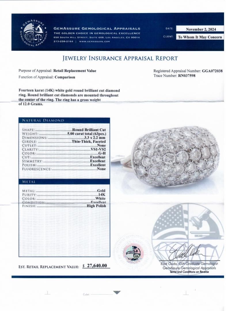 Fourteen karat (14K) white gold round brilliant cut diamond ring. Round brilliant cut diamonds are mounted throughout the center of the ring, The ring has a gross weight of 12.0 Grams. #NATURAL DIAMOND# SHAPE: Round Brilliant Cut; WEIGHT: 5.00 carat total (63pcs.); DIMENSIONS: 3.3 x 2.2mm; GIRDLE: Thin-Thick, Faceted; CUTLET: None; CLARITY: VS1-VS2; COLOR: G-H; SYMMETRY: Excellent; CUT: Excellent; POLISH: Excellent; FLUORESCENCE: None #METAL# METAL: Gold; PURITY: 14K; COLOR: White; CONDITION: Excellent; FINISH: High Polish #Size: 6 3/4