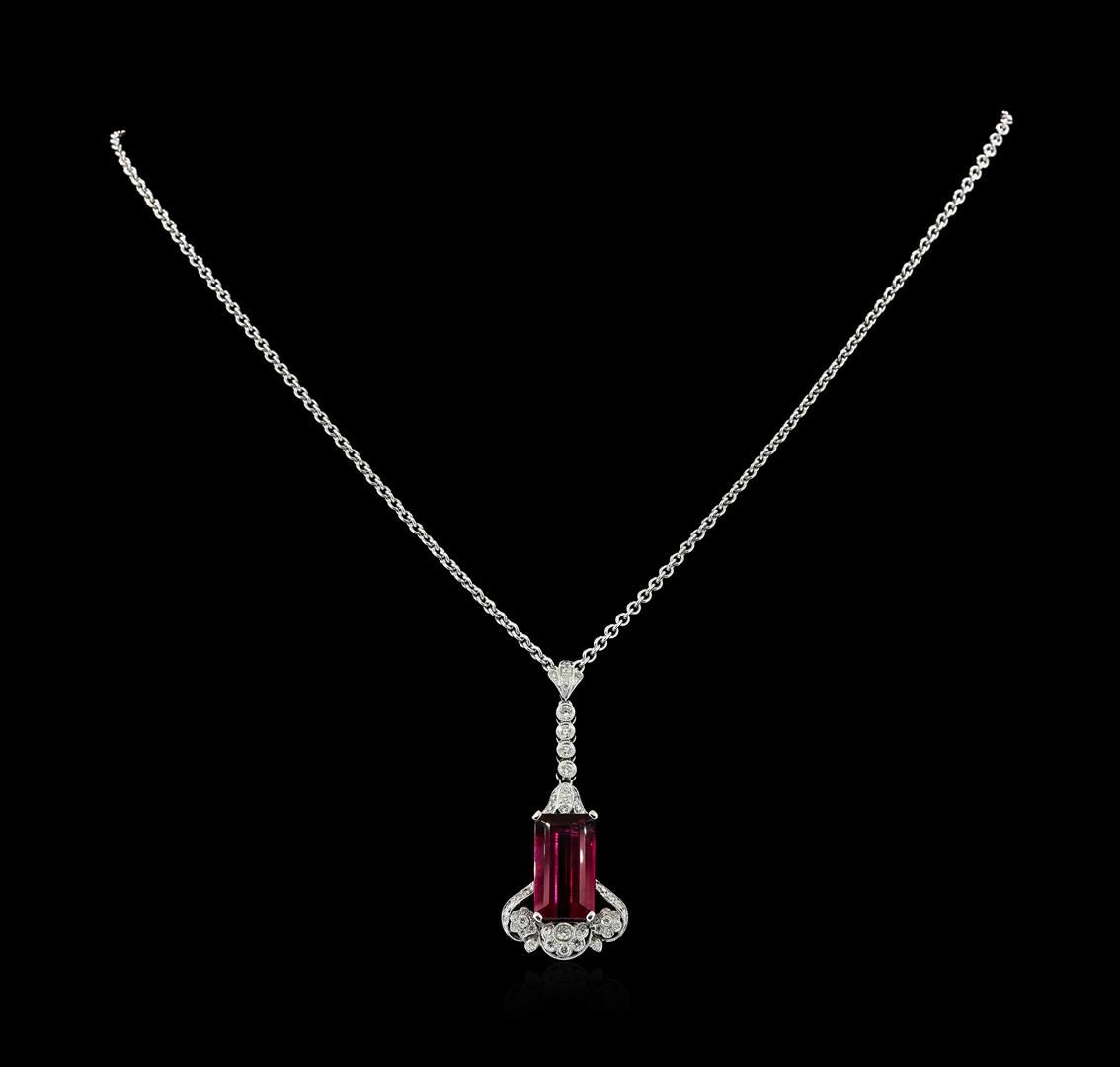 One electronically tested 18KT white gold ladies cast & assembled rubellite tourmaline and diamond pendant with chain. The pendant features a rubellite tourmaline set above a stylized diamond floral trim suspended from a flexible diamond ribbon, completed by a stylized diamond set bail. The pendant is supported by a sixteen inch length 18KT white gold cable chain, terminating in a spring ring clasp. Bright polish finish with milgrain detailing. Identified with markings of '18k 750'. Condition is good. Containing: One prong set rectangular step cut natural rubellite, measuring 15.20 x 8.40 x 4.50mm, approximate weight of 5.00ct., clarity is slightly included, type III, medium dark, moderately strong, purple red color, (GIA PR 6/4), cut is good. Transmitting light with a minimum of distortion, transparent. Naturally occurring internal & external characteristics are present. Colored Stone Grading Report attached. Graded in the setting. Ten bezel set round brilliant cut diamonds, measuring 2.20 - 1.60 x 1.14mm (depth est.) approximate total weight of 10 Stones = 0.28ct. Graded in the setting. Clarity SI-2 to I-2. Color: G - I Forty-One prong set round brilliant cut diamonds, measuring 1.20 - 1.00 x 0.66mm (depth est.) approximate total weight of 41 Stones = 0.25ct. Measurements are an average for the group. Graded in the setting. Clarity SI-2 to I-2. Color: G - I. Total Weight of Colored Stones 5.00ct.. Total Weight of Diamonds 0.53ct.. Total Weight of Pendant With Chain 10.32gm. AIG Appraised at $6,825.00.