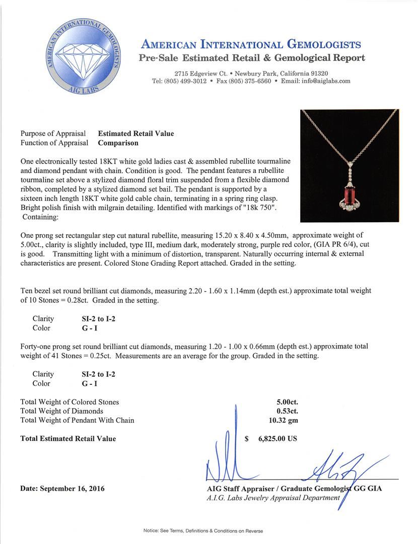 One electronically tested 18KT white gold ladies cast & assembled rubellite tourmaline and diamond pendant with chain. The pendant features a rubellite tourmaline set above a stylized diamond floral trim suspended from a flexible diamond ribbon, completed by a stylized diamond set bail. The pendant is supported by a sixteen inch length 18KT white gold cable chain, terminating in a spring ring clasp. Bright polish finish with milgrain detailing. Identified with markings of '18k 750'. Condition is good. Containing: One prong set rectangular step cut natural rubellite, measuring 15.20 x 8.40 x 4.50mm, approximate weight of 5.00ct., clarity is slightly included, type III, medium dark, moderately strong, purple red color, (GIA PR 6/4), cut is good. Transmitting light with a minimum of distortion, transparent. Naturally occurring internal & external characteristics are present. Colored Stone Grading Report attached. Graded in the setting. Ten bezel set round brilliant cut diamonds, measuring 2.20 - 1.60 x 1.14mm (depth est.) approximate total weight of 10 Stones = 0.28ct. Graded in the setting. Clarity SI-2 to I-2. Color: G - I Forty-One prong set round brilliant cut diamonds, measuring 1.20 - 1.00 x 0.66mm (depth est.) approximate total weight of 41 Stones = 0.25ct. Measurements are an average for the group. Graded in the setting. Clarity SI-2 to I-2. Color: G - I. Total Weight of Colored Stones 5.00ct.. Total Weight of Diamonds 0.53ct.. Total Weight of Pendant With Chain 10.32gm. AIG Appraised at $6,825.00.