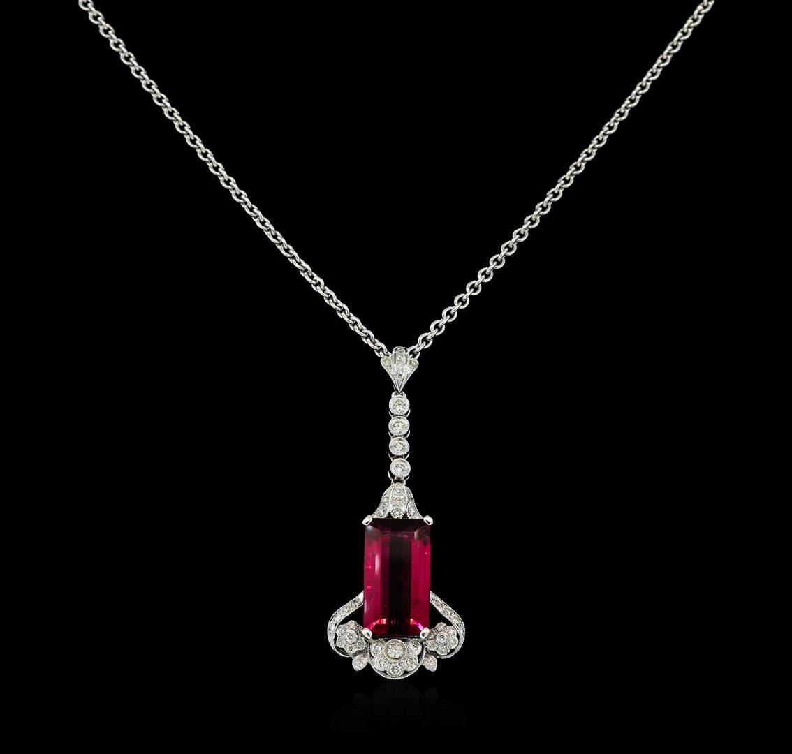 One electronically tested 18KT white gold ladies cast & assembled rubellite tourmaline and diamond pendant with chain. The pendant features a rubellite tourmaline set above a stylized diamond floral trim suspended from a flexible diamond ribbon, completed by a stylized diamond set bail. The pendant is supported by a sixteen inch length 18KT white gold cable chain, terminating in a spring ring clasp. Bright polish finish with milgrain detailing. Identified with markings of '18k 750'. Condition is good. Containing: One prong set rectangular step cut natural rubellite, measuring 15.20 x 8.40 x 4.50mm, approximate weight of 5.00ct., clarity is slightly included, type III, medium dark, moderately strong, purple red color, (GIA PR 6/4), cut is good. Transmitting light with a minimum of distortion, transparent. Naturally occurring internal & external characteristics are present. Colored Stone Grading Report attached. Graded in the setting. Ten bezel set round brilliant cut diamonds, measuring 2.20 - 1.60 x 1.14mm (depth est.) approximate total weight of 10 Stones = 0.28ct. Graded in the setting. Clarity SI-2 to I-2. Color: G - I Forty-One prong set round brilliant cut diamonds, measuring 1.20 - 1.00 x 0.66mm (depth est.) approximate total weight of 41 Stones = 0.25ct. Measurements are an average for the group. Graded in the setting. Clarity SI-2 to I-2. Color: G - I. Total Weight of Colored Stones 5.00ct.. Total Weight of Diamonds 0.53ct.. Total Weight of Pendant With Chain 10.32gm. AIG Appraised at $6,825.00.