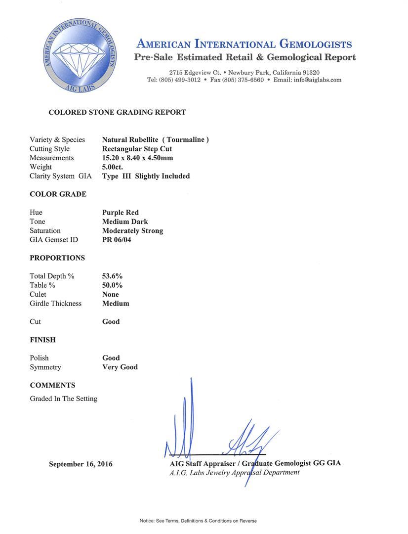 One electronically tested 18KT white gold ladies cast & assembled rubellite tourmaline and diamond pendant with chain. The pendant features a rubellite tourmaline set above a stylized diamond floral trim suspended from a flexible diamond ribbon, completed by a stylized diamond set bail. The pendant is supported by a sixteen inch length 18KT white gold cable chain, terminating in a spring ring clasp. Bright polish finish with milgrain detailing. Identified with markings of '18k 750'. Condition is good. Containing: One prong set rectangular step cut natural rubellite, measuring 15.20 x 8.40 x 4.50mm, approximate weight of 5.00ct., clarity is slightly included, type III, medium dark, moderately strong, purple red color, (GIA PR 6/4), cut is good. Transmitting light with a minimum of distortion, transparent. Naturally occurring internal & external characteristics are present. Colored Stone Grading Report attached. Graded in the setting. Ten bezel set round brilliant cut diamonds, measuring 2.20 - 1.60 x 1.14mm (depth est.) approximate total weight of 10 Stones = 0.28ct. Graded in the setting. Clarity SI-2 to I-2. Color: G - I Forty-One prong set round brilliant cut diamonds, measuring 1.20 - 1.00 x 0.66mm (depth est.) approximate total weight of 41 Stones = 0.25ct. Measurements are an average for the group. Graded in the setting. Clarity SI-2 to I-2. Color: G - I. Total Weight of Colored Stones 5.00ct.. Total Weight of Diamonds 0.53ct.. Total Weight of Pendant With Chain 10.32gm. AIG Appraised at $6,825.00.