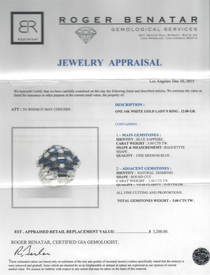 One 14KT white gold lady's ring weighing 12.00 grams. Containing: Baguette shape blue sapphires with a total weight of 5.00ct. The sapphires have a clarity of fine medium blue. The ring also contains round cut natural diamonds with a total weight of 1.00ct. The diamonds have a clarity of VS-SI and a color range of G-H. All fine cutting and proportions. RBGS Appraised at $3,200.00.