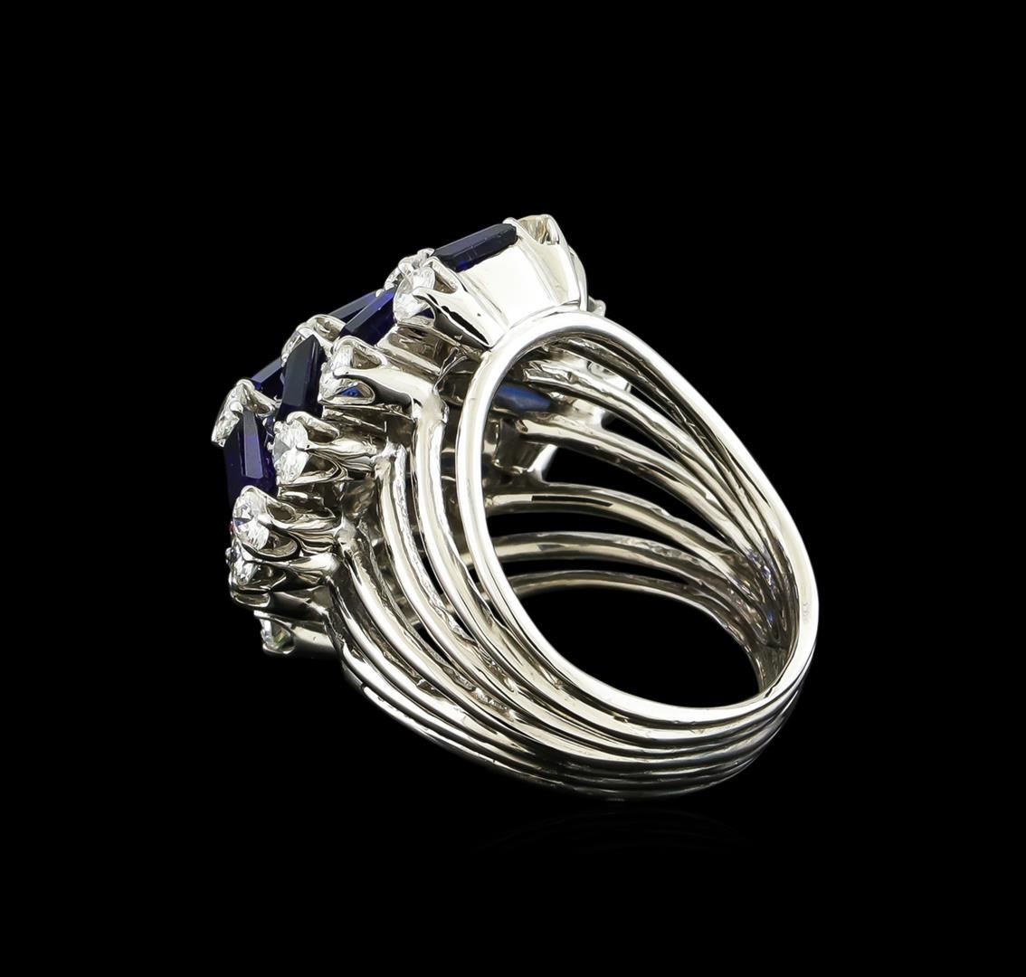 One 14KT white gold lady's ring weighing 12.00 grams. Containing: Baguette shape blue sapphires with a total weight of 5.00ct. The sapphires have a clarity of fine medium blue. The ring also contains round cut natural diamonds with a total weight of 1.00ct. The diamonds have a clarity of VS-SI and a color range of G-H. All fine cutting and proportions. RBGS Appraised at $3,200.00.