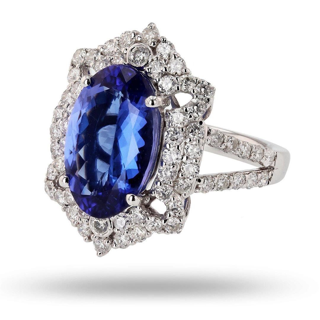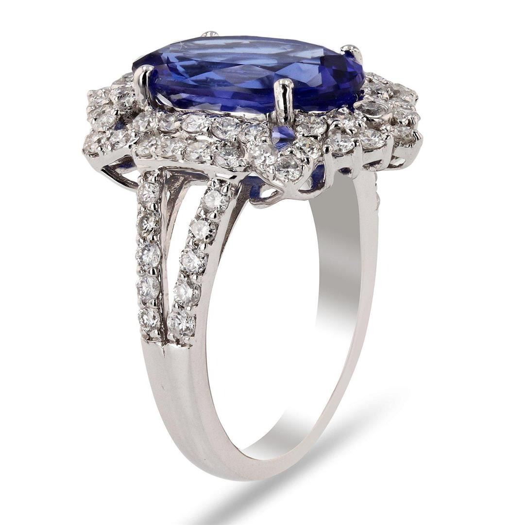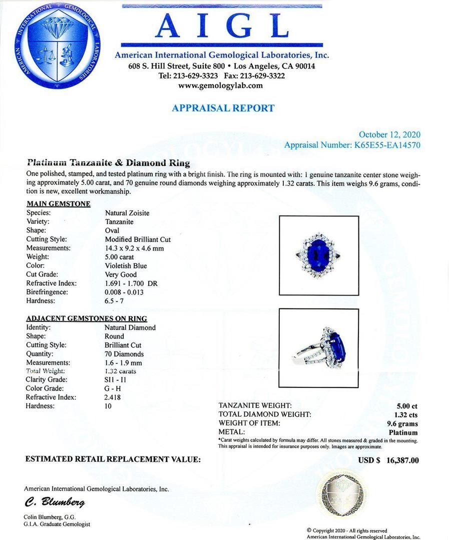 5.00ct Tanzanite and 1.32ctw Diamond Platinum Ring. Platinum Tanzanite & Diamond Ring One polished, stamped, and tested platinum ring with a bright finish. The ring is mounted with: 1 genuine tanzanite center stone weighing approximately 5.00 carat, and 70 genuine round diamonds weighing approximately 1.32 carats. This item weighs 9.6 grams, condition is new, excellent workmanship. MAIN GEMSTONE Species: Natural Zoisite Variety: Tanzanite Shape: Oval Cutting Style: Modified Brilliant Cut Measurements: 14.3 x 9.2 x 4.6mm Weight: 5.00 carat Color: Violetish Blue Cut Grade: Very Good Refractive Index: 1.691 - 1.700 DR Birefringence: 0.008 - 0.013 Hardness: 6.5 - 7 ADJACENT GEMSTONES ON RING Identity: Natural Diamond Shape: Round Cutting Style: Brilliant Cut Quantity: 70 Diamonds Measurements: 1.6 - 1.9mm Total Weight: 1.32 carats Clarity Grade: SI1 to I1 Color Grade: G - H Refractive Index: 2.418 Hardness: 10 TANZANITE WEIGHT: 5.00ct TOTAL DIAMOND WEIGHT: 1.32ctw WEIGHT OF ITEM: 9.6 grams METAL: Platinum