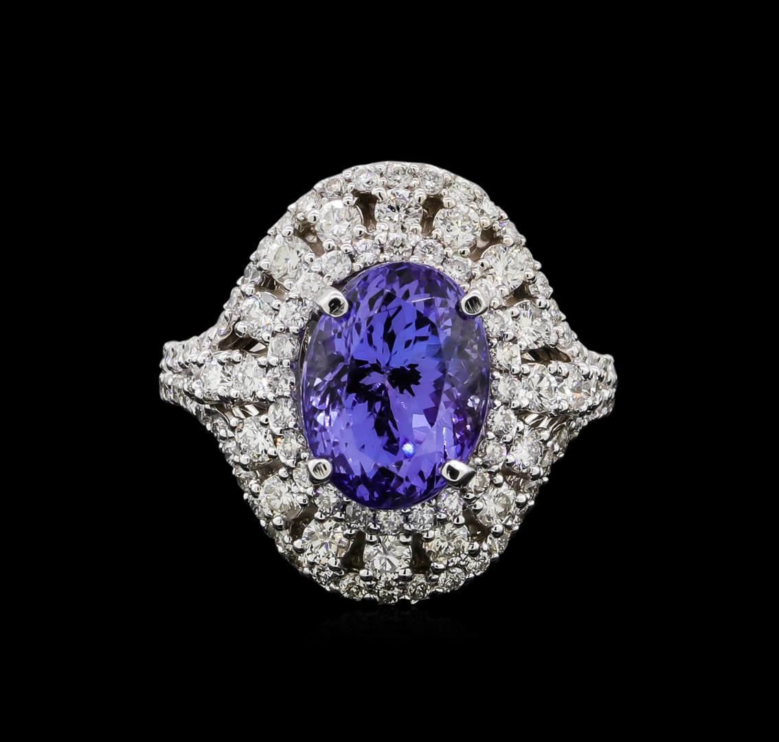 One electronically tested 14KT white gold lady's cast fashion ring with a double basket halo with a bright polish finish. The featured lady's ring has a shank measuring 3.66 millimeters in width. Identified with markings of 'K14'. Condition is new, good workmanship. Containing: One prong set oval modified brilliant cut natural tanzanite, measuring 11.22 x 8.50 x 7.71mm, (depth est.) approximate weight of 5.00ct., clarity is eye clean, medium, very slightly grayish, violetish blue color, (GIA vB 5/3), cut is very good. Transmitting light with no distortion, transparent. Colored gemstones are presumed to have been subjected to commonly used enhancement processes. Graded in the setting. Seventy-Eight prong set round brilliant cut diamonds, measuring 1.45 - 1.35 x 0.84mm (depth est.) approximate total weight of 78 Stones = 0.81ct. Graded in the setting. Clarity SI-1 to SI-2. Color: H - I Cut Good Eighteen prong set round brilliant cut diamonds, measuring 2.30 - 2.10 x 1.32mm (depth est.) approximate total weight of 18 Stones = 0.70ct. Graded in the setting. Clarity SI-1 to SI-2. Color: H - I Cut Good Two prong set round brilliant cut diamonds, measuring 1.80 - 1.70 x 1.05mm (depth est.) approximate total weight of 2 Stones = 0.04ct. Graded in the setting. Clarity SI-1 to SI-2. Color: H - I Cut Good. Total Weight of Colored Stones 5.00ct.. Total Weight of Diamonds 1.55ct.. Total Weight of Ring 9.00gm. GAS Appraised at $13,100.00.