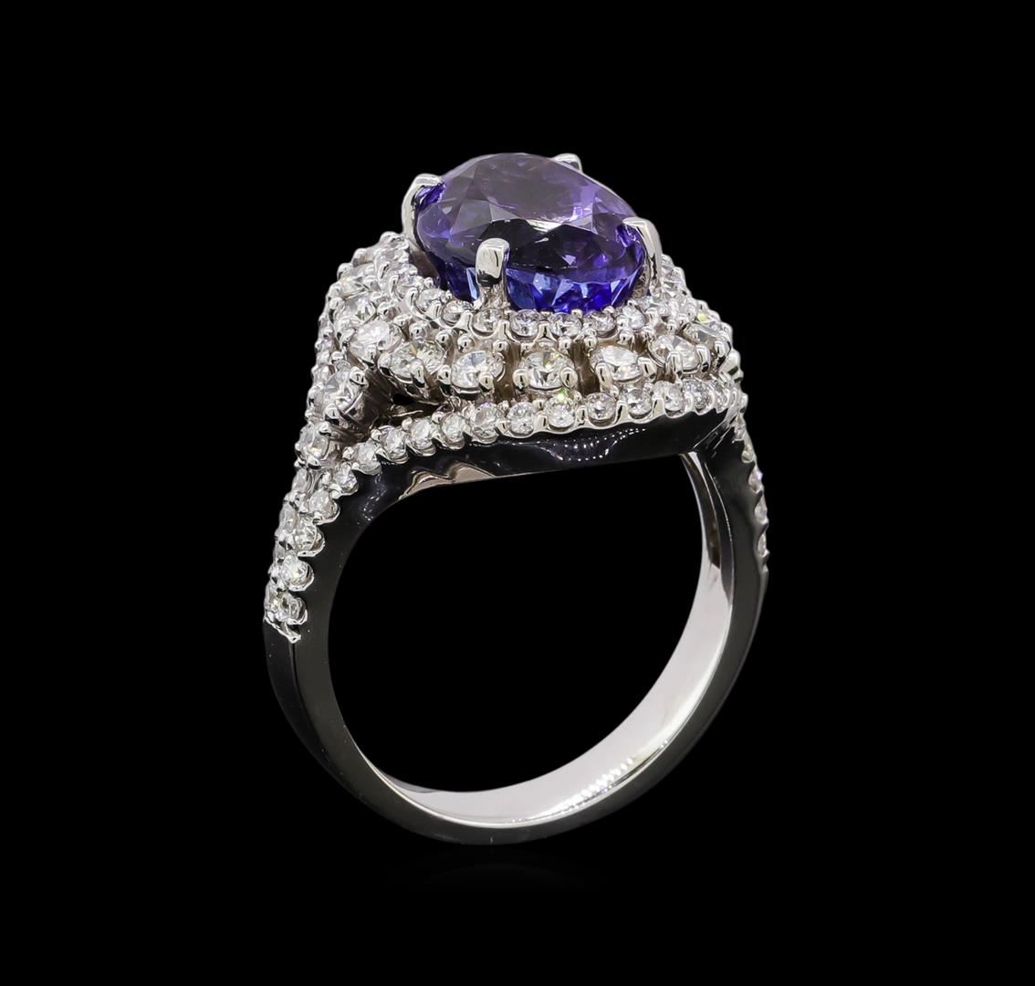 One electronically tested 14KT white gold lady's cast fashion ring with a double basket halo with a bright polish finish. The featured lady's ring has a shank measuring 3.66 millimeters in width. Identified with markings of 'K14'. Condition is new, good workmanship. Containing: One prong set oval modified brilliant cut natural tanzanite, measuring 11.22 x 8.50 x 7.71mm, (depth est.) approximate weight of 5.00ct., clarity is eye clean, medium, very slightly grayish, violetish blue color, (GIA vB 5/3), cut is very good. Transmitting light with no distortion, transparent. Colored gemstones are presumed to have been subjected to commonly used enhancement processes. Graded in the setting. Seventy-Eight prong set round brilliant cut diamonds, measuring 1.45 - 1.35 x 0.84mm (depth est.) approximate total weight of 78 Stones = 0.81ct. Graded in the setting. Clarity SI-1 to SI-2. Color: H - I Cut Good Eighteen prong set round brilliant cut diamonds, measuring 2.30 - 2.10 x 1.32mm (depth est.) approximate total weight of 18 Stones = 0.70ct. Graded in the setting. Clarity SI-1 to SI-2. Color: H - I Cut Good Two prong set round brilliant cut diamonds, measuring 1.80 - 1.70 x 1.05mm (depth est.) approximate total weight of 2 Stones = 0.04ct. Graded in the setting. Clarity SI-1 to SI-2. Color: H - I Cut Good. Total Weight of Colored Stones 5.00ct.. Total Weight of Diamonds 1.55ct.. Total Weight of Ring 9.00gm. GAS Appraised at $13,100.00.