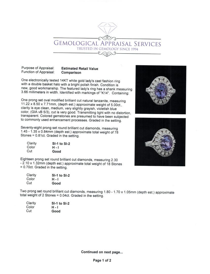 One electronically tested 14KT white gold lady's cast fashion ring with a double basket halo with a bright polish finish. The featured lady's ring has a shank measuring 3.66 millimeters in width. Identified with markings of 'K14'. Condition is new, good workmanship. Containing: One prong set oval modified brilliant cut natural tanzanite, measuring 11.22 x 8.50 x 7.71mm, (depth est.) approximate weight of 5.00ct., clarity is eye clean, medium, very slightly grayish, violetish blue color, (GIA vB 5/3), cut is very good. Transmitting light with no distortion, transparent. Colored gemstones are presumed to have been subjected to commonly used enhancement processes. Graded in the setting. Seventy-Eight prong set round brilliant cut diamonds, measuring 1.45 - 1.35 x 0.84mm (depth est.) approximate total weight of 78 Stones = 0.81ct. Graded in the setting. Clarity SI-1 to SI-2. Color: H - I Cut Good Eighteen prong set round brilliant cut diamonds, measuring 2.30 - 2.10 x 1.32mm (depth est.) approximate total weight of 18 Stones = 0.70ct. Graded in the setting. Clarity SI-1 to SI-2. Color: H - I Cut Good Two prong set round brilliant cut diamonds, measuring 1.80 - 1.70 x 1.05mm (depth est.) approximate total weight of 2 Stones = 0.04ct. Graded in the setting. Clarity SI-1 to SI-2. Color: H - I Cut Good. Total Weight of Colored Stones 5.00ct.. Total Weight of Diamonds 1.55ct.. Total Weight of Ring 9.00gm. GAS Appraised at $13,100.00.