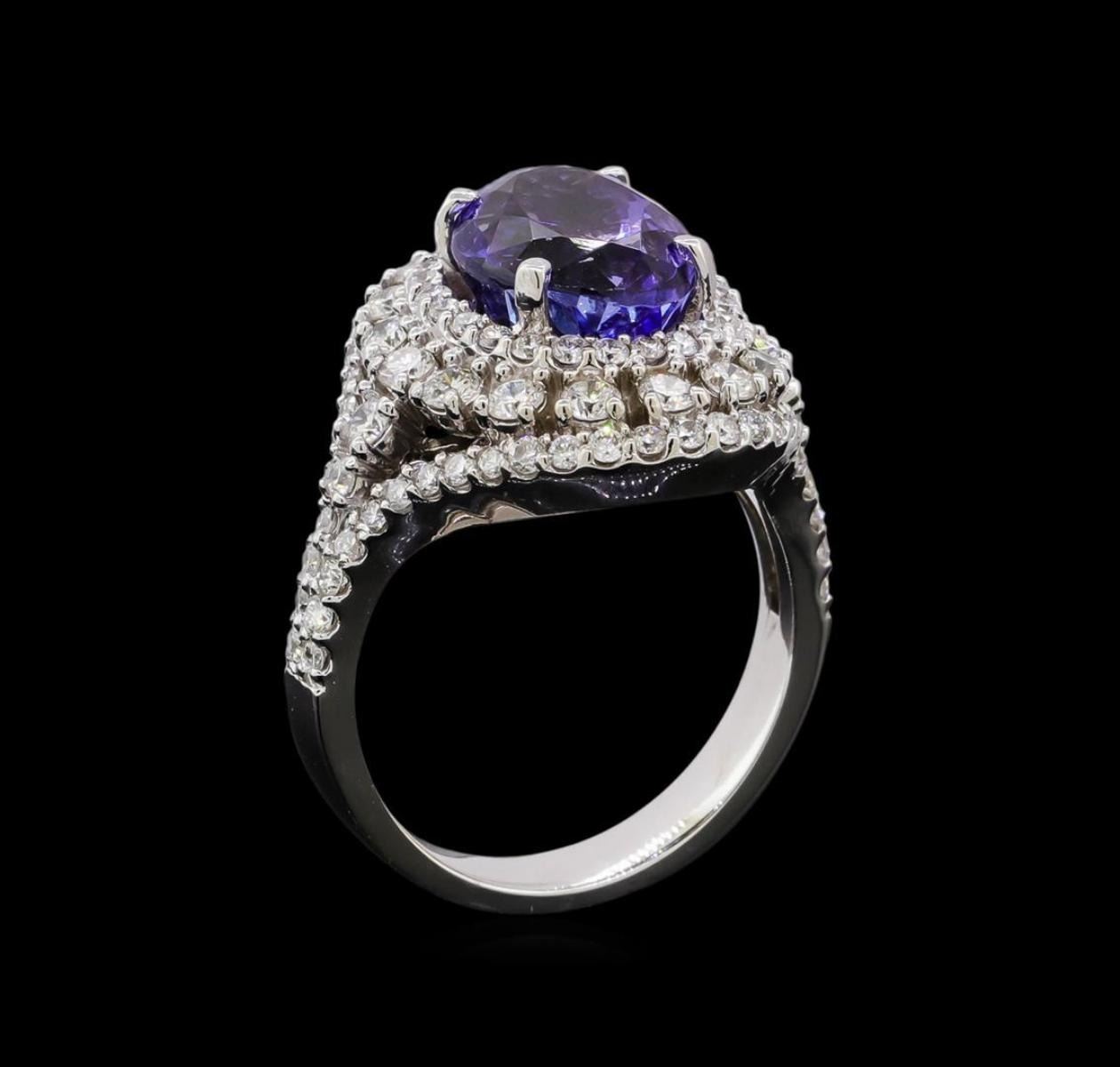 One electronically tested 14KT white gold lady's cast fashion ring with a double basket halo with a bright polish finish. The featured lady's ring has a shank measuring 3.66 millimeters in width. Identified with markings of 'K14'. Condition is new, good workmanship. Containing: One prong set oval modified brilliant cut natural tanzanite, measuring 11.22 x 8.50 x 7.71mm, (depth est.) approximate weight of 5.00ct., clarity is eye clean, medium, very slightly grayish, violetish blue color, (GIA vB 5/3), cut is very good. Transmitting light with no distortion, transparent. Colored gemstones are presumed to have been subjected to commonly used enhancement processes. Graded in the setting. Seventy-Eight prong set round brilliant cut diamonds, measuring 1.45 - 1.35 x 0.84mm (depth est.) approximate total weight of 78 Stones = 0.81ct. Graded in the setting. Clarity SI-1 to SI-2. Color: H - I Cut Good Eighteen prong set round brilliant cut diamonds, measuring 2.30 - 2.10 x 1.32mm (depth est.) approximate total weight of 18 Stones = 0.70ct. Graded in the setting. Clarity SI-1 to SI-2. Color: H - I Cut Good Two prong set round brilliant cut diamonds, measuring 1.80 - 1.70 x 1.05mm (depth est.) approximate total weight of 2 Stones = 0.04ct. Graded in the setting. Clarity SI-1 to SI-2. Color: H - I Cut Good. Total Weight of Colored Stones 5.00ct.. Total Weight of Diamonds 1.55ct.. Total Weight of Ring 9.00gm. GAS Appraised.