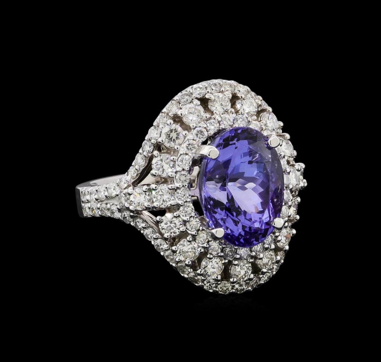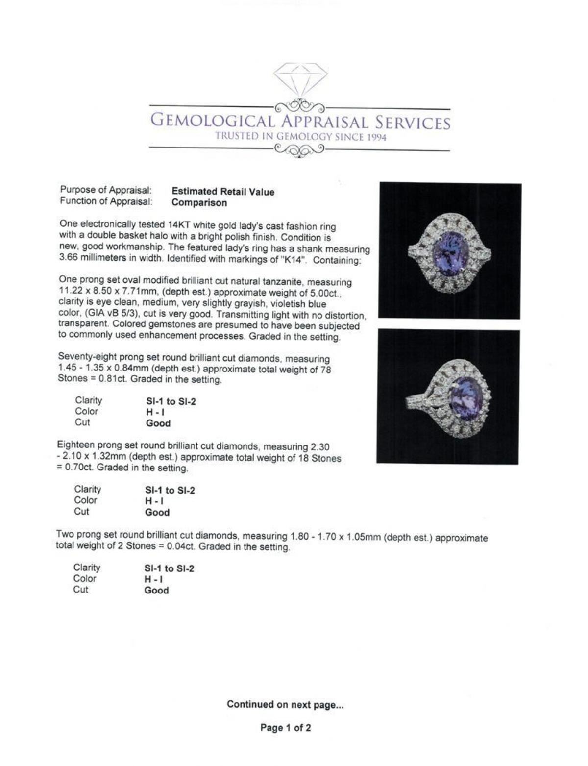 One electronically tested 14KT white gold lady's cast fashion ring with a double basket halo with a bright polish finish. The featured lady's ring has a shank measuring 3.66 millimeters in width. Identified with markings of 'K14'. Condition is new, good workmanship. Containing: One prong set oval modified brilliant cut natural tanzanite, measuring 11.22 x 8.50 x 7.71mm, (depth est.) approximate weight of 5.00ct., clarity is eye clean, medium, very slightly grayish, violetish blue color, (GIA vB 5/3), cut is very good. Transmitting light with no distortion, transparent. Colored gemstones are presumed to have been subjected to commonly used enhancement processes. Graded in the setting. Seventy-Eight prong set round brilliant cut diamonds, measuring 1.45 - 1.35 x 0.84mm (depth est.) approximate total weight of 78 Stones = 0.81ct. Graded in the setting. Clarity SI-1 to SI-2. Color: H - I Cut Good Eighteen prong set round brilliant cut diamonds, measuring 2.30 - 2.10 x 1.32mm (depth est.) approximate total weight of 18 Stones = 0.70ct. Graded in the setting. Clarity SI-1 to SI-2. Color: H - I Cut Good Two prong set round brilliant cut diamonds, measuring 1.80 - 1.70 x 1.05mm (depth est.) approximate total weight of 2 Stones = 0.04ct. Graded in the setting. Clarity SI-1 to SI-2. Color: H - I Cut Good. Total Weight of Colored Stones 5.00ct.. Total Weight of Diamonds 1.55ct.. Total Weight of Ring 9.00gm. GAS Appraised.