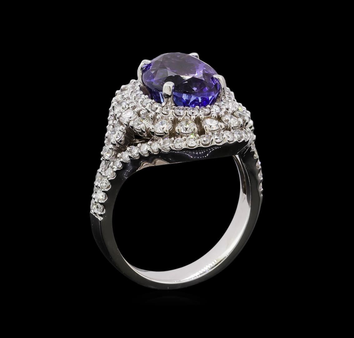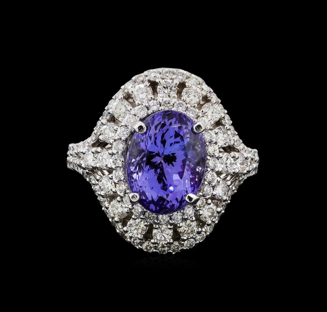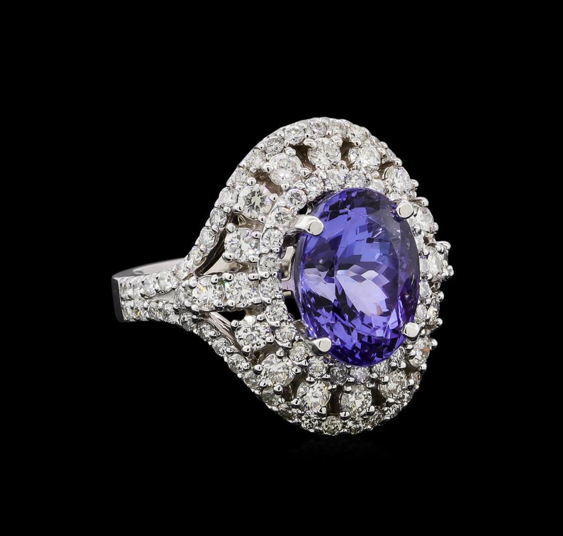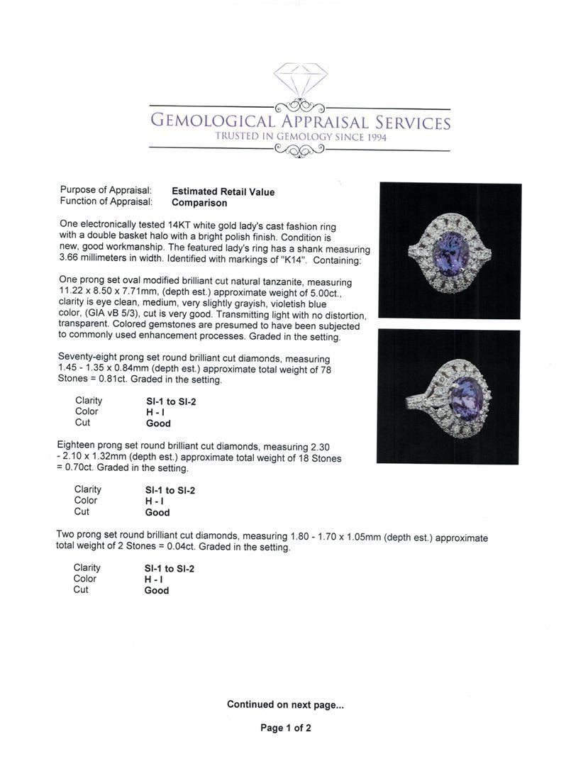 One electronically tested 14KT white gold lady's cast fashion ring with a double basket halo with a bright polish finish. The featured lady's ring has a shank measuring 3.66 millimeters in width. Identified with markings of 'K14'. Condition is new, good workmanship. Containing: One prong set oval modified brilliant cut natural tanzanite, measuring 11.22 x 8.50 x 7.71mm, (depth est.) approximate weight of 5.00 ct., clarity is eye clean, medium, very slightly grayish, violetish blue color, (GIA vB 5/3), cut is very good. Transmitting light with no distortion, transparent. Colored gemstones are presumed to have been subjected to commonly used enhancement processes. Graded in the setting. Seventy-Eight prong set round brilliant cut diamonds, measuring 1.45 - 1.35 x 0.84mm (depth est.) approximate total weight of 78 Stones = 0.81ct. Graded in the setting. Clarity SI-1 to SI-2. Color: H - I Cut Good Eighteen prong set round brilliant cut diamonds, measuring 2.30 - 2.10 x 1.32mm (depth est.) approximate total weight of 18 Stones = 0.70 ct. Graded in the setting. Clarity SI-1 to SI-2. Color: H - I Cut Good Two prong set round brilliant cut diamonds, measuring 1.80 - 1.70 x 1.05mm (depth est.) approximate total weight of 2 Stones = 0.04ct. Graded in the setting. Clarity SI-1 to SI-2. Color: H - I Cut Good. Total Weight of Colored Stones 5.00 ct.. Total Weight of Diamonds 1.55ct.. Total Weight of Ring 9.00gm. GAS Appraised.