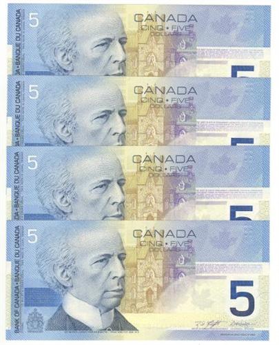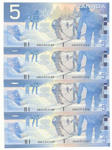 Bank of Canada; $5.00 insert 2003, BC-62aA-i, Gem UNC, signature; Knight Dodge, serial; HNH5353404-05-06-07. Lot of 4 consecutive insert notes (replacement).