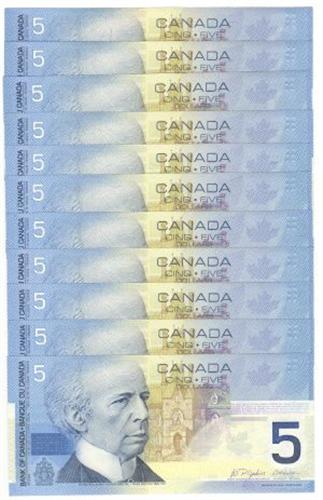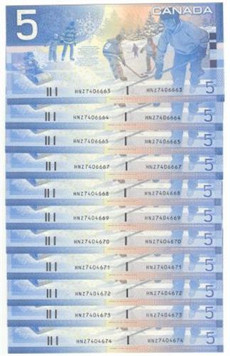 Bank of Canada; $5.00 insert 2004, BC-62bA, Gem UNC, signature; Jenkins Dodge, serial; HNZ7406663-64-65-66-67-68-69-70-71-72-73-74. Lot of 11 consecutive insert notes (replacement).