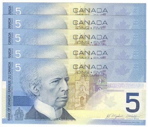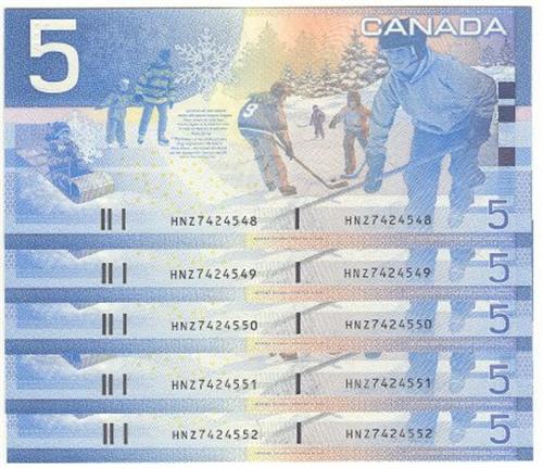 Bank of Canada; $5.00 insert 2004, BC-62bA, Gem UNC, signature; Jenkins Dodge, serial; HNZ7424548-49-50-51-52. Lot of 5 consecutive insert notes (replacement).