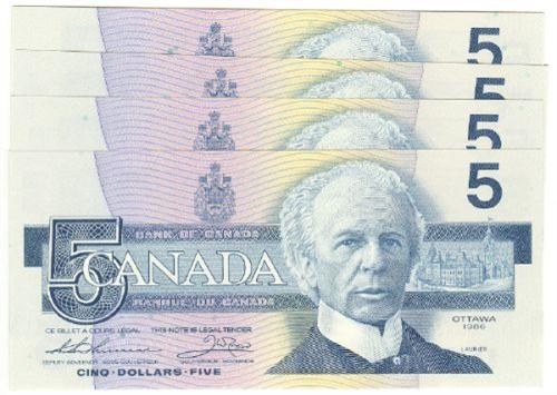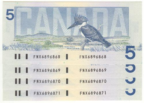 Bank of Canada; $5.00 replacement 1986, BC-56cA, Gem UNC, signature; Thiessen Crow, serial; FNX6896868-69-70-71. Lot of 4 consecutive replacement notes.