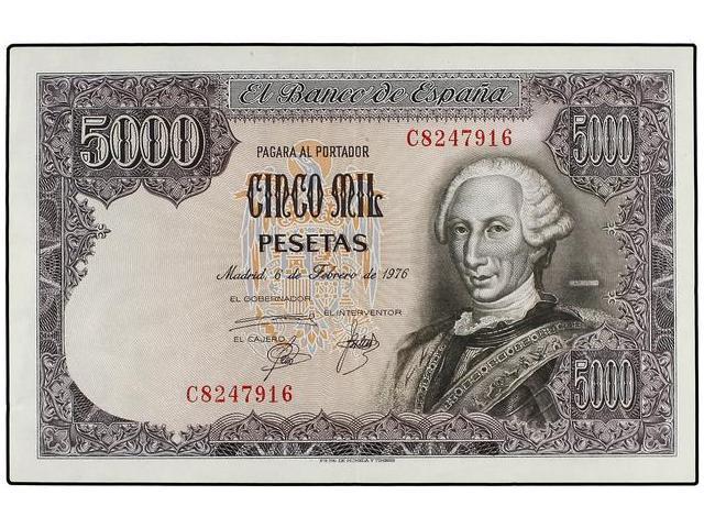 5.000 Pesetas. 6 Febrero 1976. Carlos III. Serie C. Ed-E1a; LB-285a. EBC-.