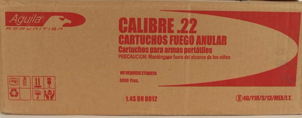 Consisting of one full case of 5,000 Aguila SuperExtra Eley primed 40 grain lead solid point ammunition.