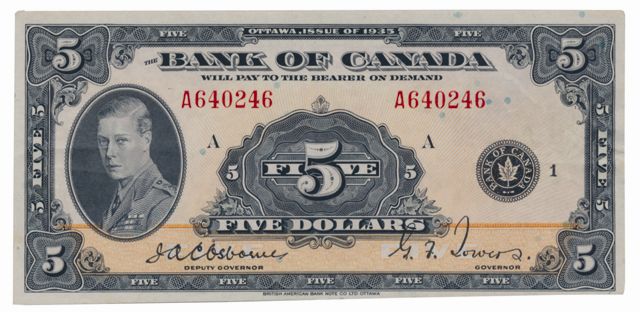 1935 Issue. English Text. BC-5. No. A640246/A. PMG graded AU-50. Vibrant colours and quite attractive.