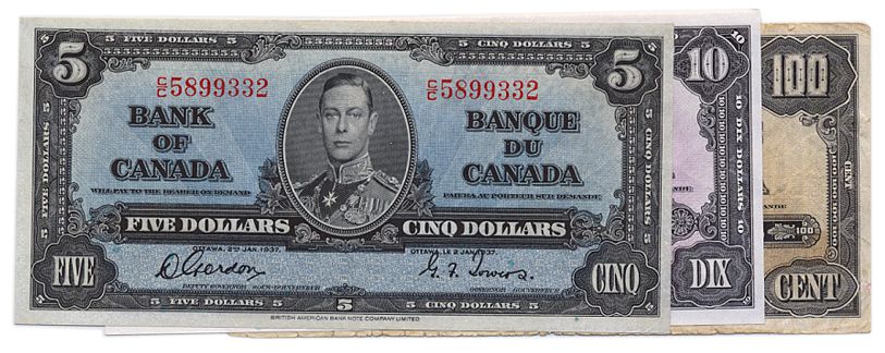 1937 Issue. BC-23b. Gordon-Towers. No. C/C5899332. EF; $10.00. 1937 Issue. BC-24c. Coyne-Towers. No. A/T6643692. AU; $100.00. 1937 Issue. BC-27c. No. B/J4872642. VG. Lot of three (3) notes.