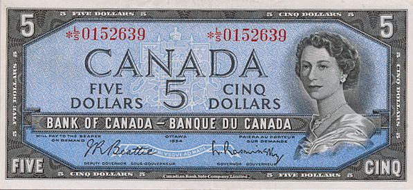 1954 Issue. BC-39bA. Beattie-Rasminsky. No. *L/S0152639. A scarce ‘replacement’ note. BCS graded EF-45.