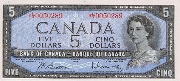 1954 Issue. BC-39bA. Beattie-Rasminsky. No. *N/X0050289. A scarce ‘replacement’ note. BCS graded AU-55.