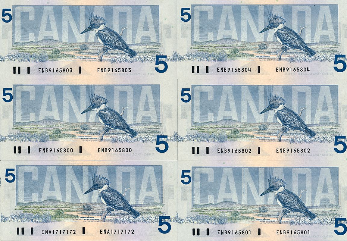 1986 Issue. BC-56a. Crow-Bouey. No. ENA1717172. AU; No’s ENB9165800, 801, 802, 803, 804. All Unc; No. ENB9165831. Unc. Total of seven (7) notes.