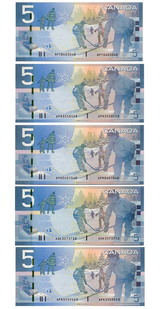 Issue of 2006. (Printed 2006). BC-67a. No. AOK3573753. Choice Unc-63; $5.00. Issue of 2006. (Printed 2008). No. APR3559553, No. APR3558553, No. APR0407040. All Choice Unc-63. Lot of five (5) BCS graded three digit Radar notes.