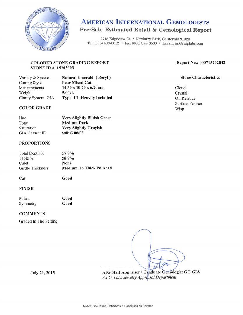 One electronically tested 14KT yellow gold ladies cast emerald and diamond ring with a bright polish finish. The featured emerald is set within a diamond bezel supported by diamond set shoulders, completed by a two millimeter wide band. Identified with markings of "14K". Condition is good. Containing: One prong set pear mixed cut natural emerald, measuring 14.30 x 10.70 x 6.20mm, approximate weight of 5.00ct., clarity is heavily included, type III, medium dark, very slightly grayish, very slightly bluish green color, (GIA vslbG 6/3), cut is good. Transmitting light somewhat diffusely, translucent. Naturally occurring internal & external characteristics are present. Indications of oil residue. Colored Stone Grading Report attached. Graded in the setting. Twenty-Eight prong set round brilliant cut diamonds approximate total weight of 28 Stones = 0.40ct. Graded in the setting. Clarity VS-2 to SI-1 Color G - I. Total Weight of Colored Stones 5.00ct. Total Weight of Diamonds 0.40ct. Total Weight of Ring 5.49 grams. AIG Appraised at $8,125.00.