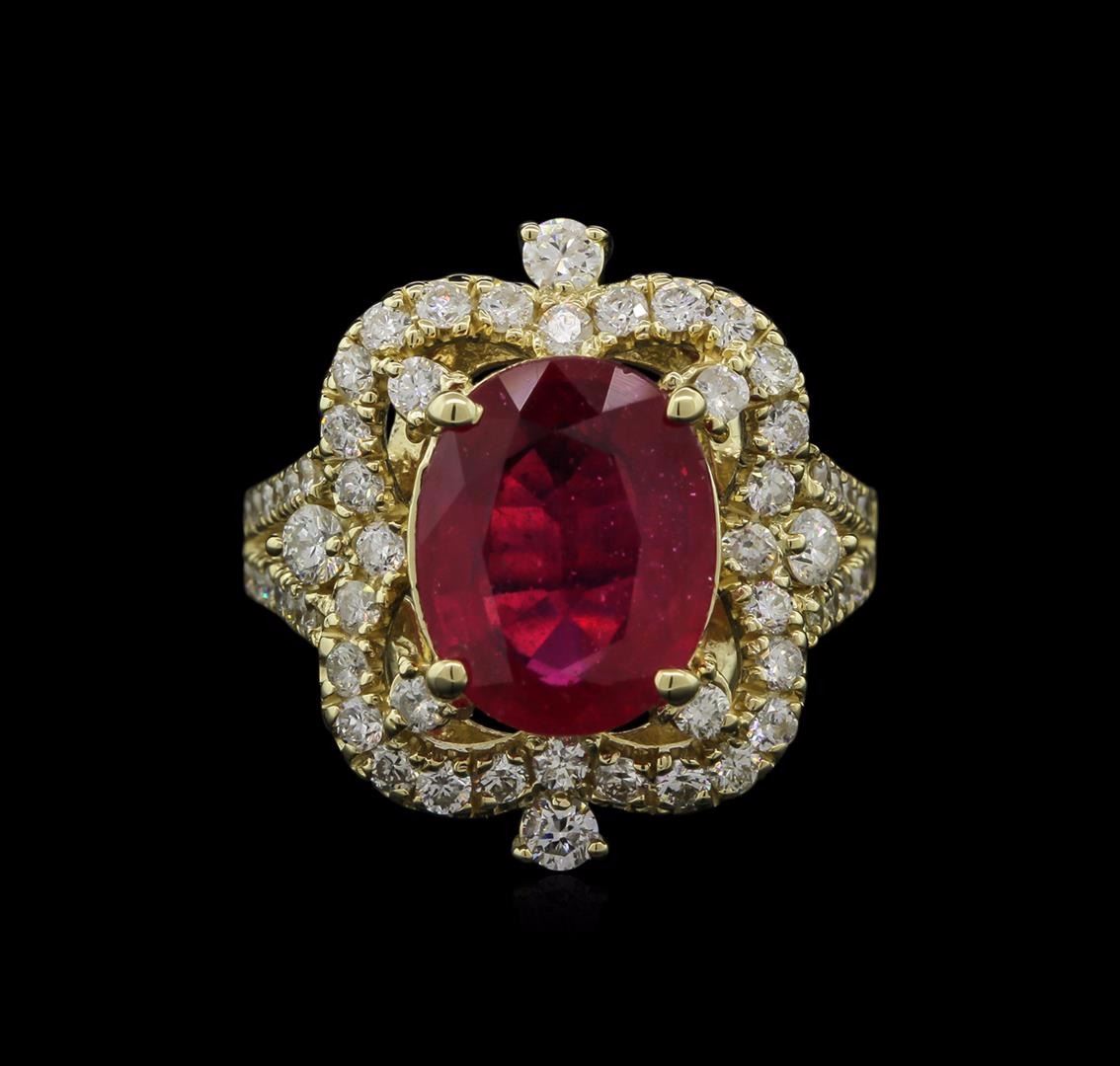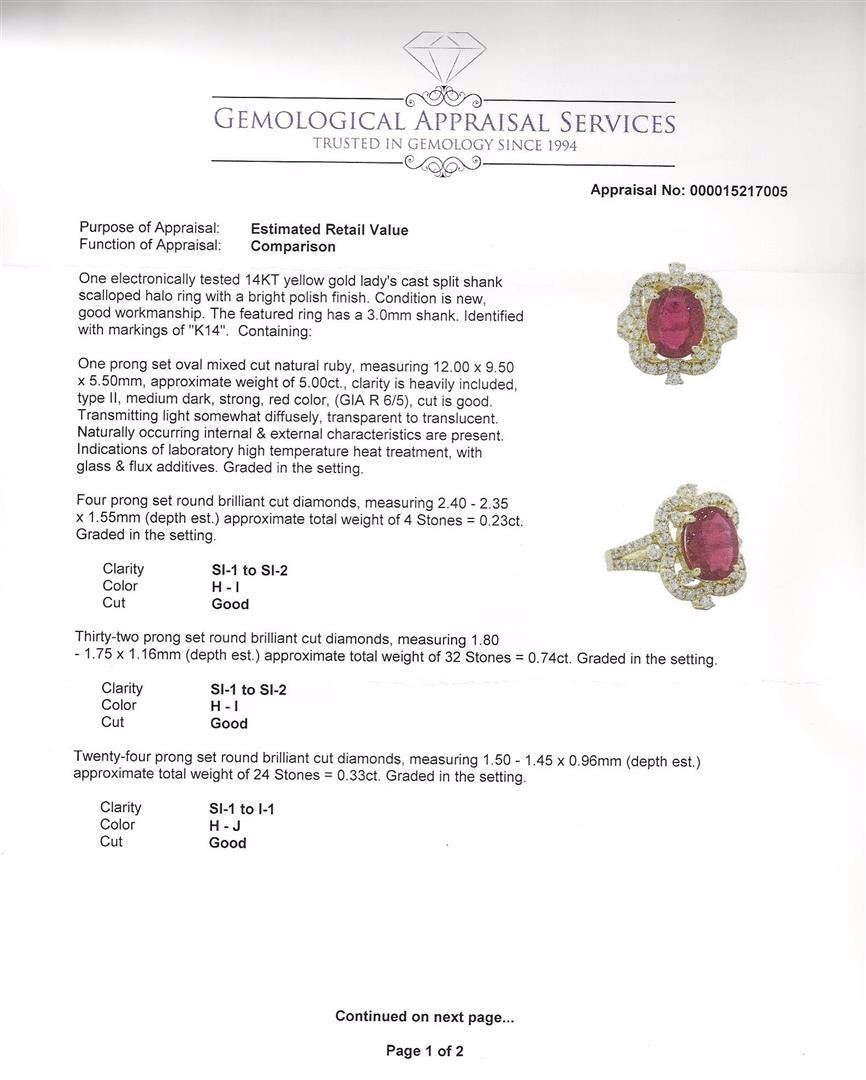 One electronically tested 14KT yellow gold lady's cast split shank scalloped halo ring with a bright polish finish. The featured ring has a 3.0mm shank. Identified with markings of "K14". Condition is new, good workmanship. Containing: One prong set oval mixed cut natural ruby, measuring 12.00 x 9.50 x 5.50mm, approximate weight of 5.00ct., clarity is heavily included, type II, medium dark, strong, red color, (GIA R 6/5), cut is good. Transmitting light somewhat diffusely, transparent to translucent. Naturally occurring internal & external characteristics are present. Indications of laboratory high temperature heat treatment, with glass & flux additives. Graded in the setting. Four prong set round brilliant cut diamonds, measuring 2.40 - 2.35 x 1.55mm (depth est.) approximate. Total Weight of 4 Stones = 0.23ct. Graded in the setting. Clarity: SI-1 to SI-2. Color: H - I. Cut Good Thirty-Two prong set round brilliant cut diamonds, measuring 1.80 - 1.75 x 1.16mm (depth est.) approximate. Total Weight of 32 Stones = 0.74ct. Graded in the setting. Clarity: SI-1 to SI-2. Color: H - I. Cut Good Twenty-Four prong set round brilliant cut diamonds, measuring 1.50 - 1.45 x 0.96mm (depth est.) approximate. Total Weight of 24 Stones = 0.33ct. Graded in the setting. Clarity: SI-1 to I-1. Color: H - Good. Total Weight of Colored Stones 5.00ct. Total Weight of Diamonds 1.30ct. Total Weight of Ring 8.50gm. GAS Appraised at $8,305.00.