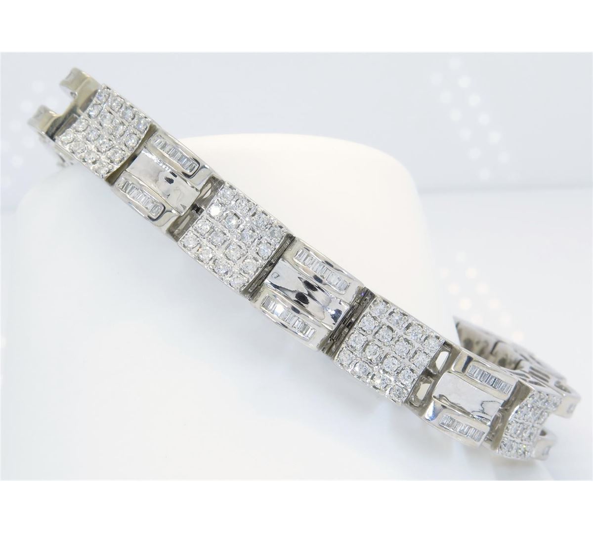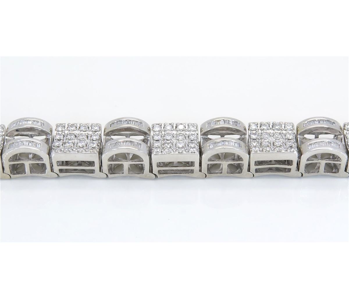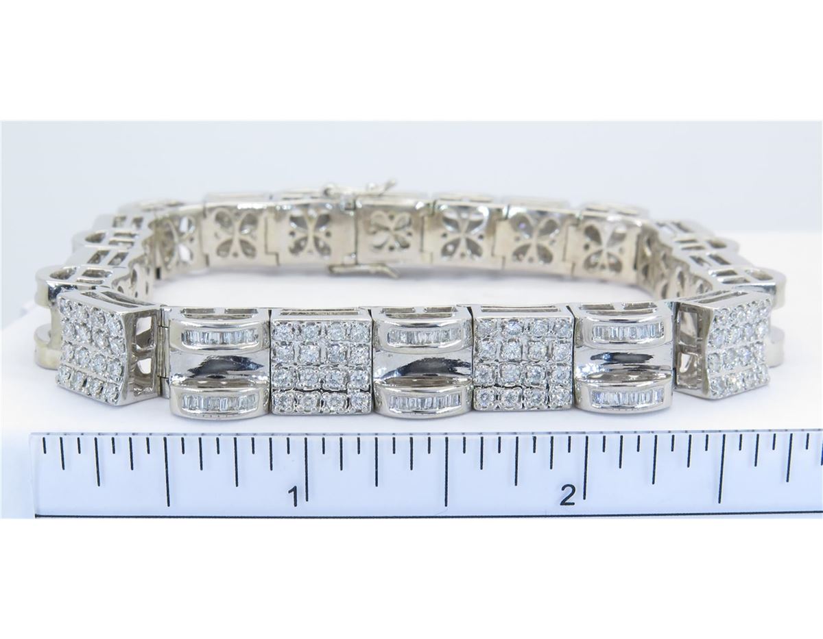 One tested 14K white gold mens diamond bracelet. Condition is new. Containing: 176 Round Brilliant Cut Diamonds, 176 Baguette Cut Diamonds. Clarity: I-SI, Color: G-H. Approximate Total diamond weight: 5CTW. Diamonds are graded in the mounting, unless otherwise stated. Weight of bracelet: 65.6 grams. Size: 8.5"