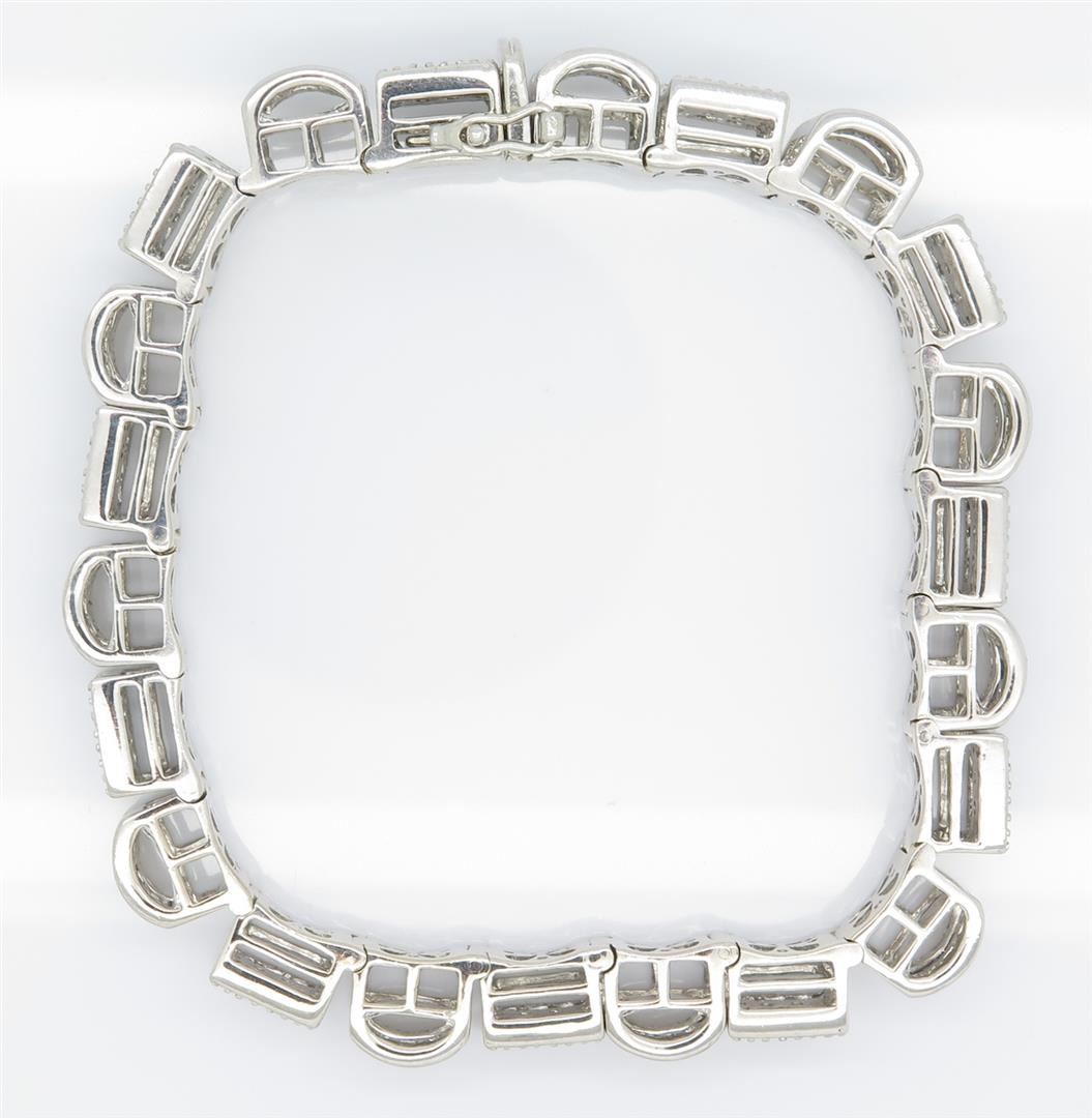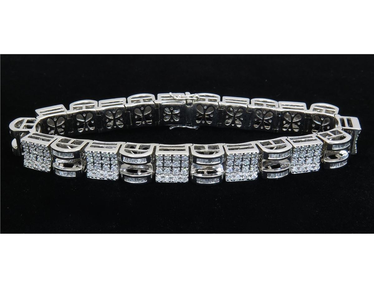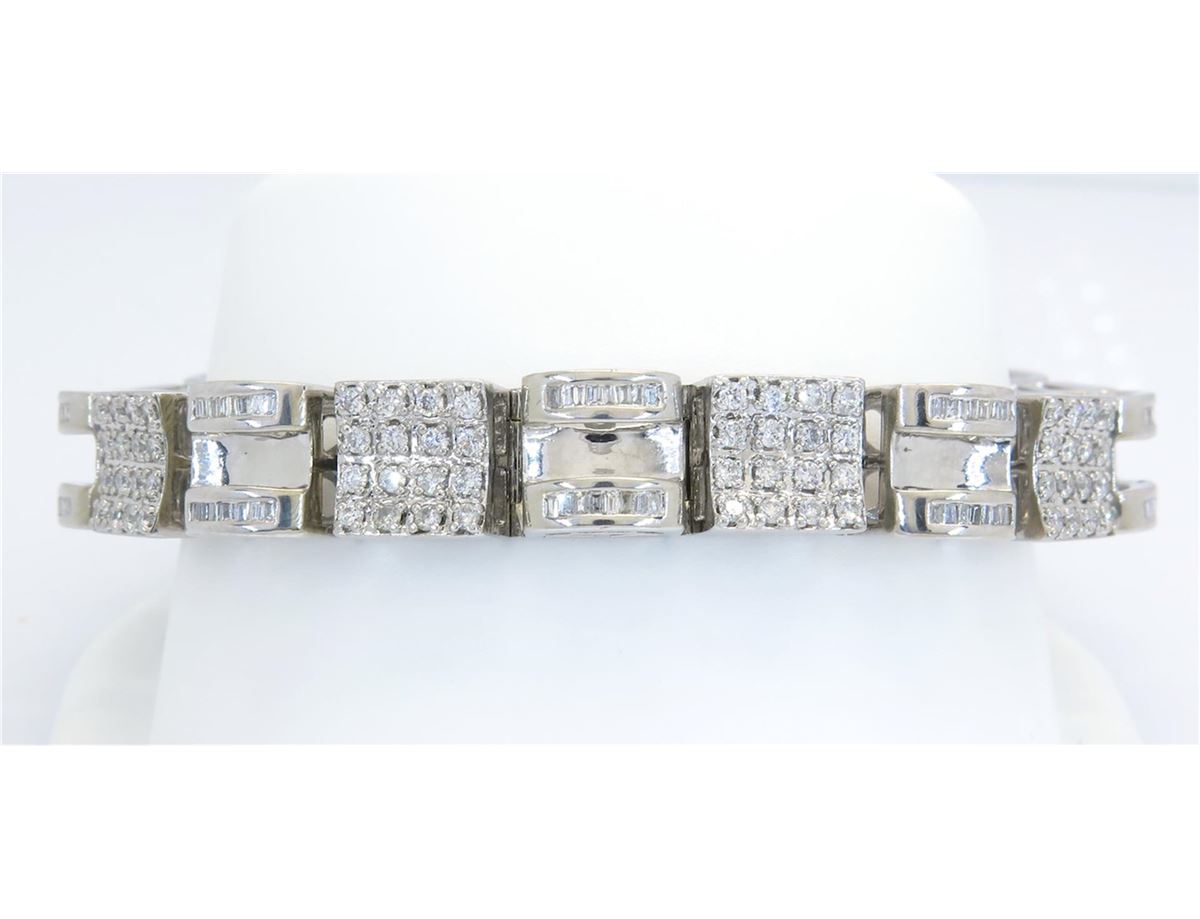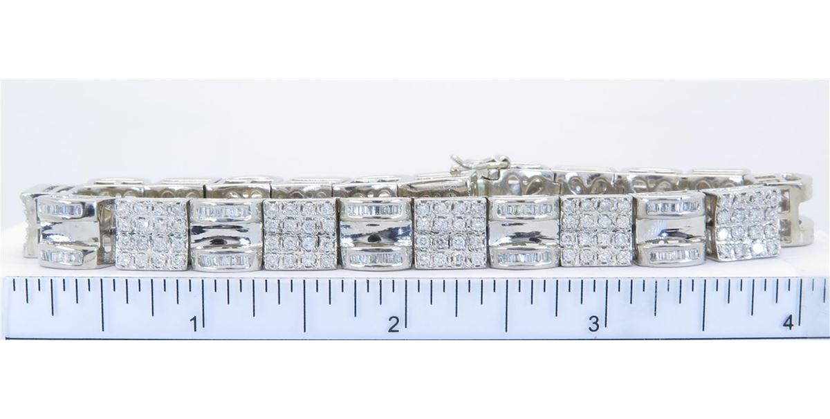 One tested 14K white gold mens diamond bracelet. Condition is new. Containing: 176 Round Brilliant Cut Diamonds, 176 Baguette Cut Diamonds. Clarity: I-SI, Color: G-H. Approximate Total diamond weight: 5CTW. Diamonds are graded in the mounting, unless otherwise stated. Weight of bracelet: 65.6 grams. Size: 8.5"