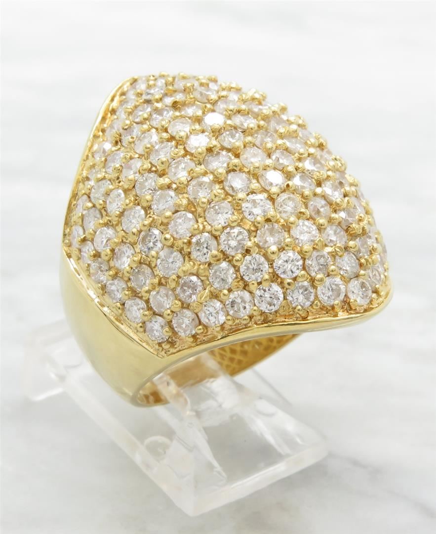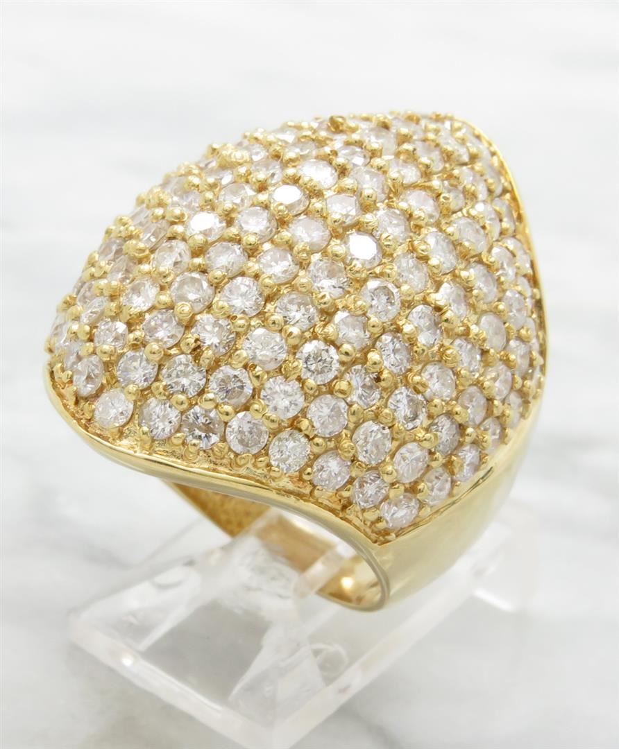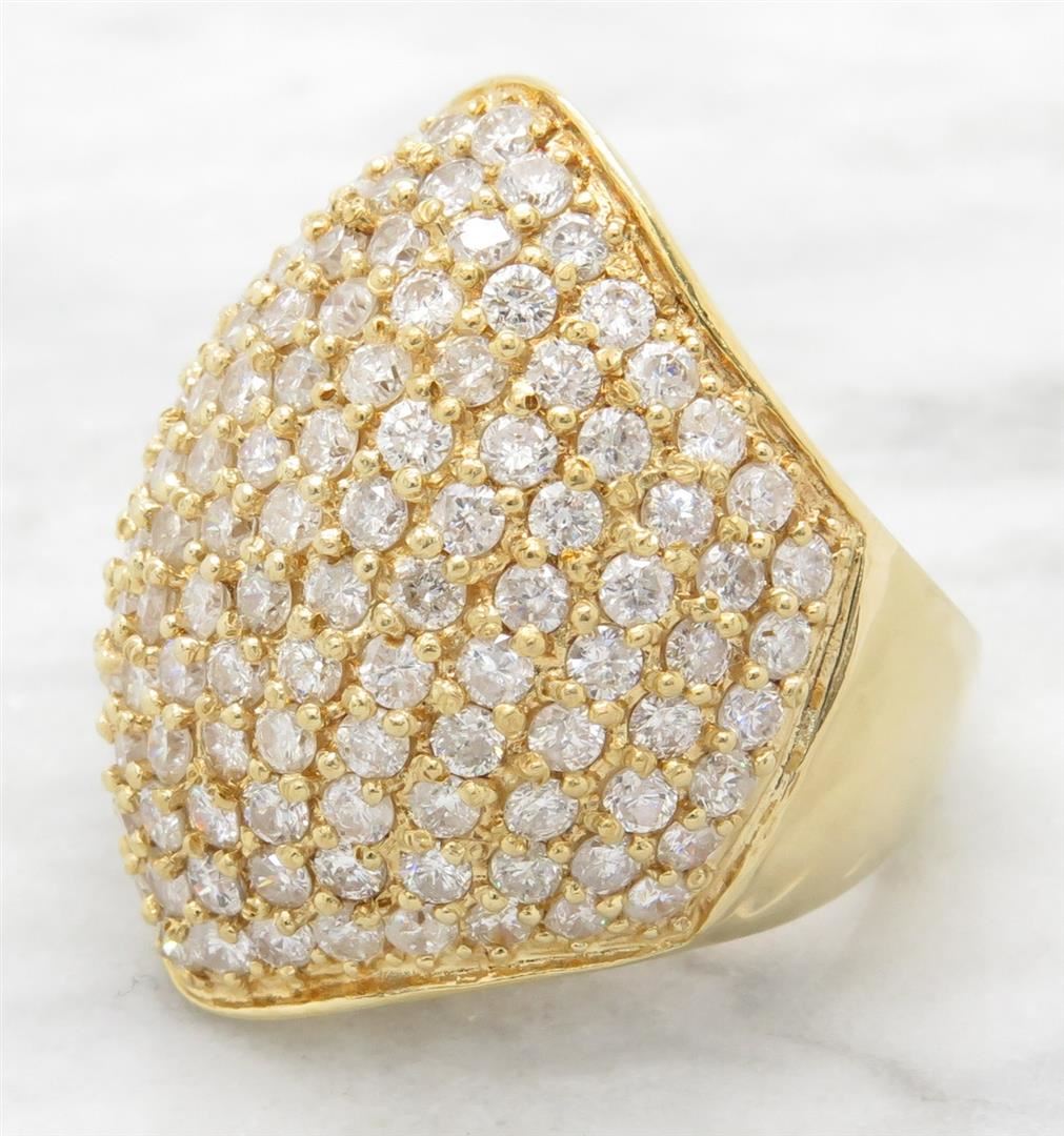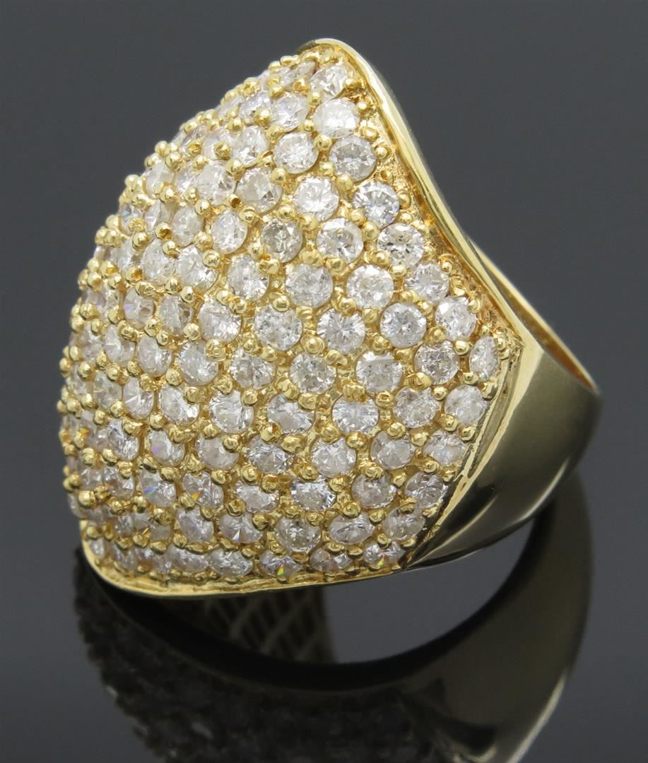 One tested 18K yellow gold diamond ring. Containing: 139 Round Brilliant Cut Diamonds. Clarity: I, Color: G-I. Approximate total diamond weight: 5.00CTW. Diamonds are graded in the mounting, unless otherwise stated. Weight: 14.6 grams, Size: 7.5.