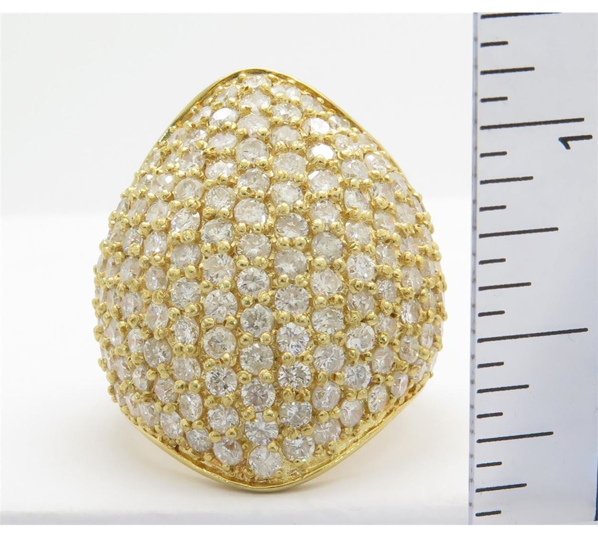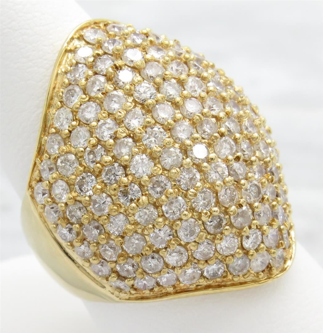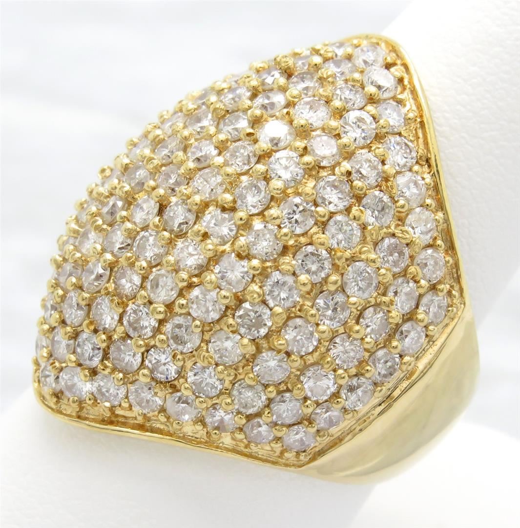 One tested 18K yellow gold diamond ring. Containing: 139 Round Brilliant Cut Diamonds. Clarity: I, Color: G-I. Approximate total diamond weight: 5.00CTW. Diamonds are graded in the mounting, unless otherwise stated. Weight: 14.6 grams, Size: 7.5.