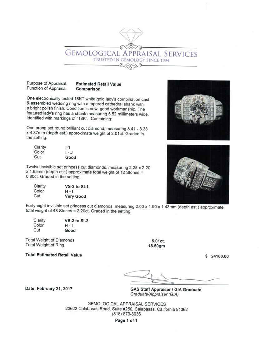 One electronically tested 18KT white gold lady's combination cast & assembled wedding ring with a tapered cathedral shank with a bright polish finish. The featured lady's ring has a shank measuring 5.52 millimeters wide. Identified with markings of '18K'. Condition is new, good workmanship. Containing: One prong set round brilliant cut diamond, measuring 8.41 - 8.38 x 4.87mm (depth est.) approximate weight of 2.01ct. Graded in the setting. Clarity I-1. Color: I - J Cut Good Twelve invisible set princess cut diamonds, measuring 2.25 x 2.20 x 1.65mm (depth est.) approximate total weight of 12 Stones = 0.80ct. Graded in the setting. Clarity VS-2 to SI-1. Color: H - I Cut Very Good Forty-Eight invisible set princess cut diamonds, measuring 2.00 x 1.90 x 1.43mm (depth est.) approximate total weight of 48 Stones = 2.20ct. Graded in the setting. Clarity VS-2 to SI-2. Color: H - I Cut Good. Total Weight of Diamonds 5.01ct.. Total Weight of Ring 18.50gm GAS Appraised at $24,100.00.