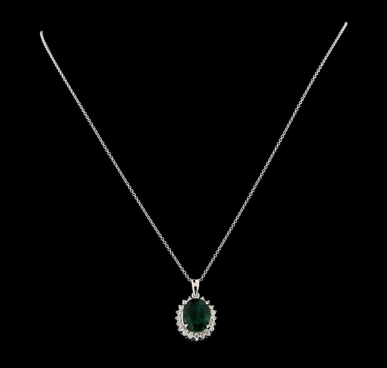 One electronically tested 14KT white gold lady's combination cast & assembled fashion pendant & chain 18.0' long, 1.2mm oval cable link with a lobster claw clasp with a basket halo with a bright polish finish. Identified with markings of '14K'. Condition is new, good workmanship. Containing: One prong set oval modified mixed cut natural emerald, measuring 12.79 x 9.96 x 5.61mm, (depth est.) 20%. bulge factor, approximate weight of 5.01ct., clarity is heavily included, medium dark, moderately strong, green color, (GIA G 6/4), cut is good. Transmitting light somewhat diffusely, semi-transparent to translucent. Naturally occurring internal & external characteristics are present. Indications of oil residue. Colored gemstones are presumed to have been subjected to commonly used enhancement processes. Graded in the setting. Twenty prong set round brilliant cut diamonds, measuring 2.10 - 2.00 x 1.27mm (depth est.) approximate total weight of 20 Stones = 0.67ct. Graded in the setting. Clarity SI-1 to SI-2. Color: G - H Cut Good. Total Weight of Colored Stones 5.01ct.. Total Weight of Diamonds 0.67ct.. Total Weight of Pendant & Chain 6.20gm. GAS Appraised.