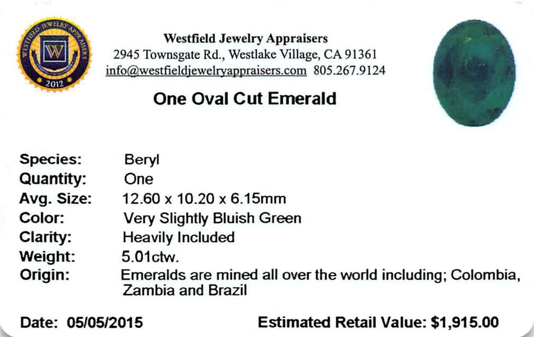 One oval mixed cut natural emerald, measuring 12.60 x 10.20 x 6.15mm, exact weight 5.01ct., clarity is heavily included, type III, medium dark, very slightly grayish, very slightly bluish green color, (GIA vslbG 6/3) Indications of multiple laboratory enhancements, including high temperature heat treatment. Westfield Appraised at $1,915.00.