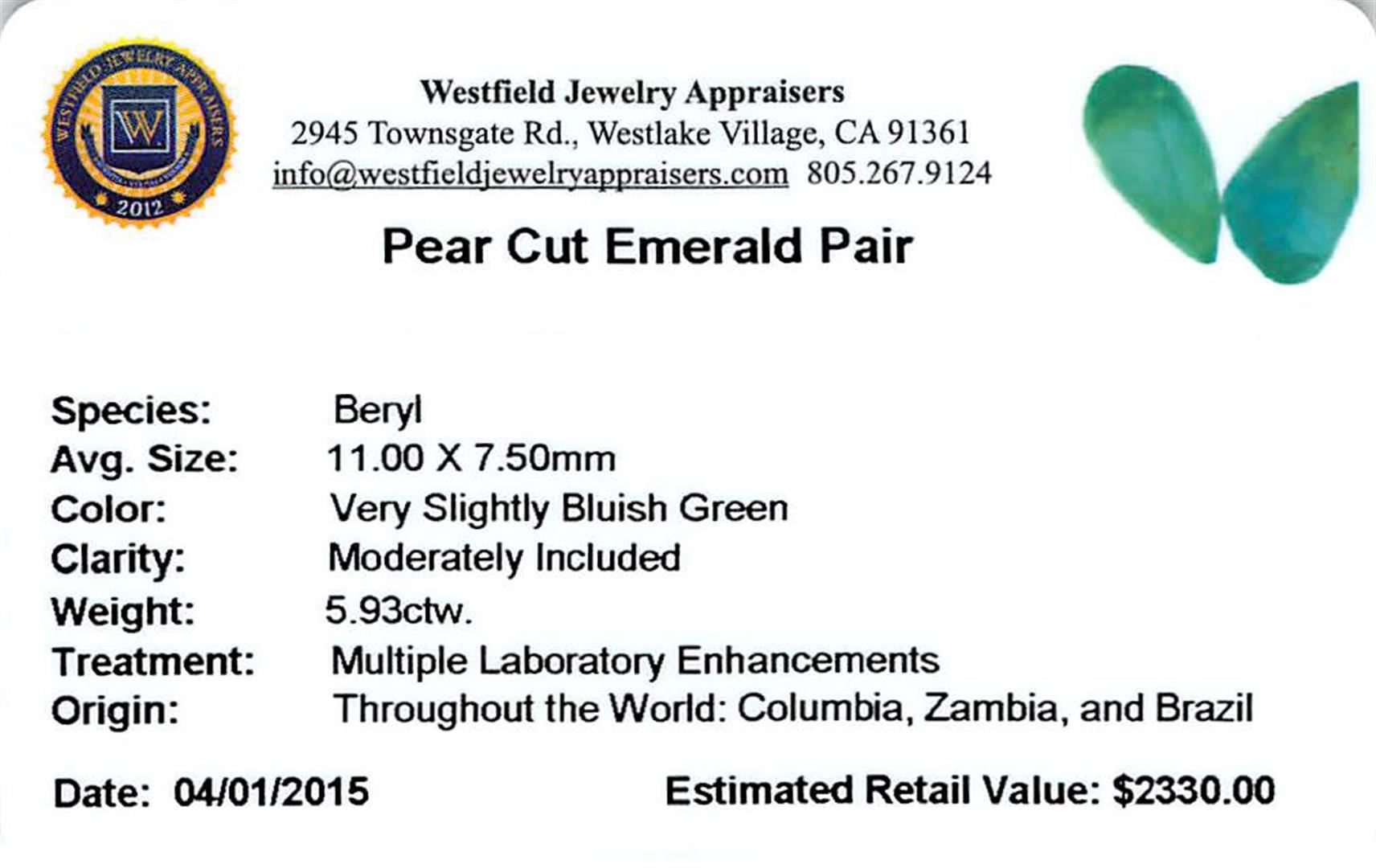 Three pear cut natural emeralds, measuring 10.09 x 6.10 x 2.60mm, exact total weight 4.33ct., clarity is moderately included, type III, medium light, very slightly grayish, very slightly bluish green color, (GIA vslbG 4/3), cut is good. Westfield Appraised at $2,330.00.