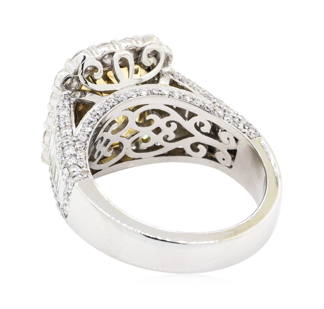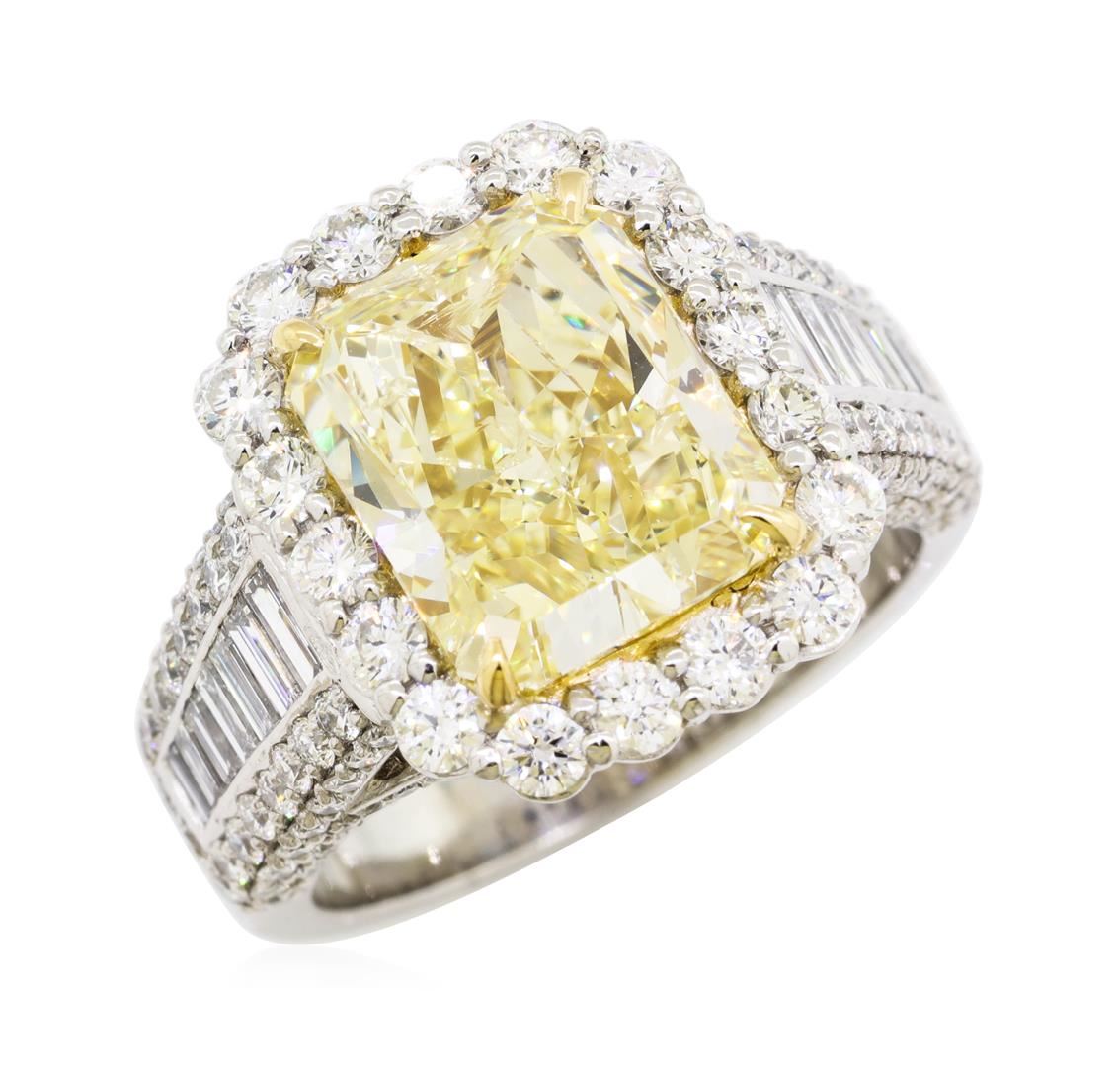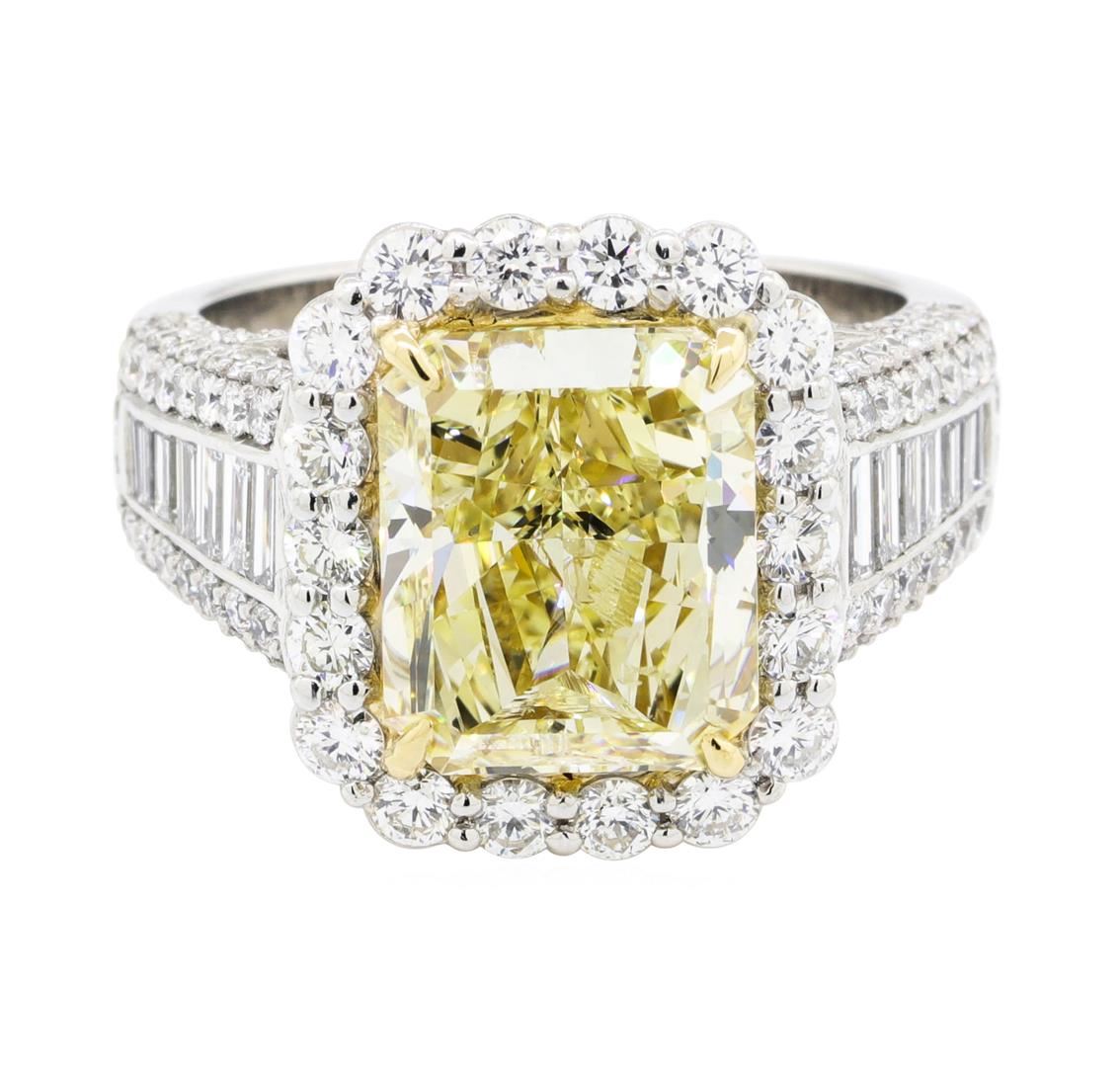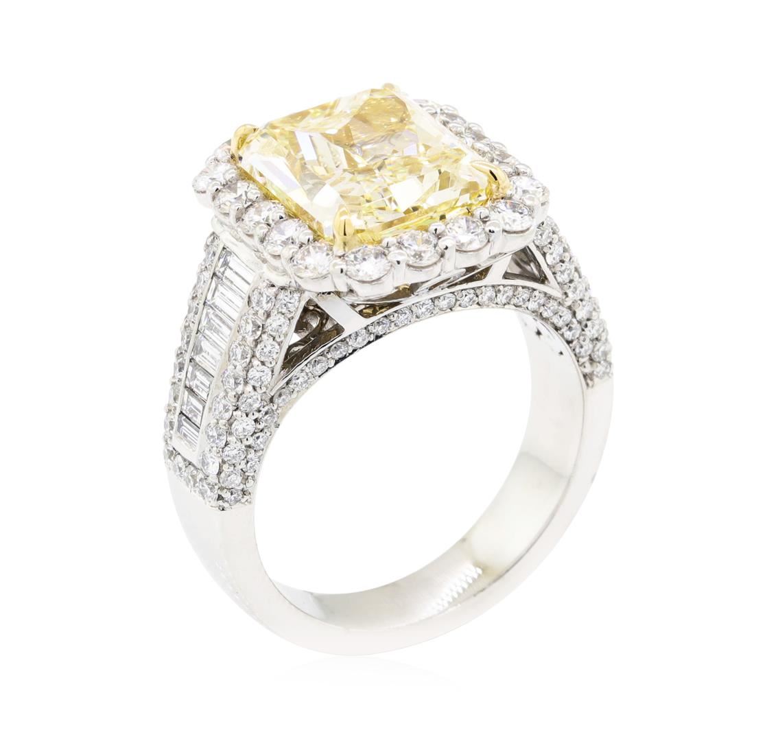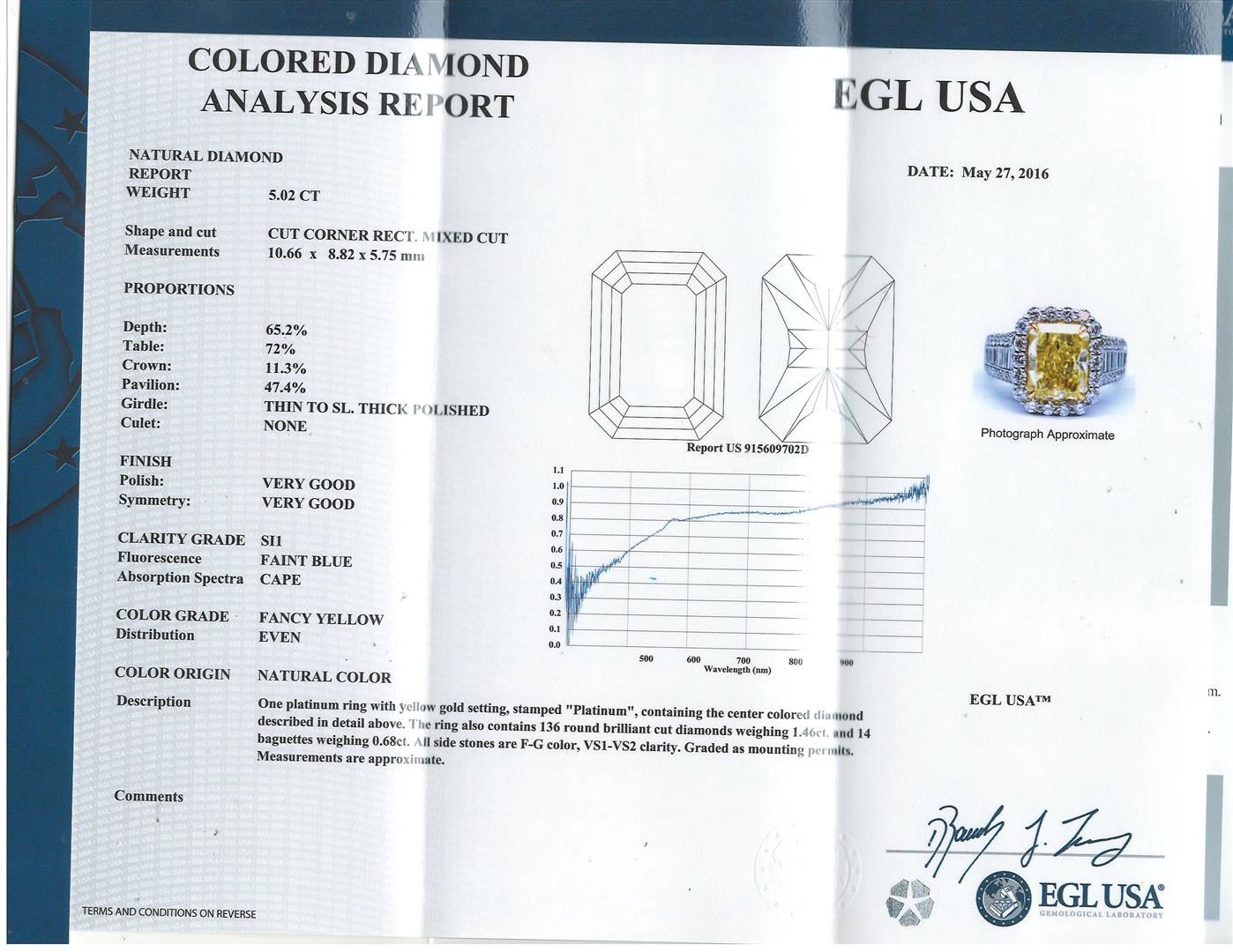 One electronically tested platinum lady's combination cast & assembled wedding ring with a tapered shank with a bright polish finish. The featured lady's ring has an 18KT yellow gold center setting and a shank measuring 4.05 millimeters wide. Identified with markings of 'PT 950'. Condition is new, good workmanship. Containing: One prong set radiant shaped cut diamond, measuring 10.66 x 8.82 x 5.75mm (depth est.) , 12.00.%. GTCF approximate weight of 5.02ct. Graded in the setting in the EGL USA Laboratory, Report #915609702D.Girdle: Thin to Slightly Thick PolishedCulet: NoneFluorescence: Faint Blue. Color Fancy Yellow Clarity SI-1 Cut Very Good Eighteen prong set round brilliant cut diamonds, measuring 2.10 - 2.05 x 1.29mm (depth est.) approximate total weight of 18 Stones = 0.62ct. Graded in the setting. Color F - G Clarity VS-1 to VS-2 Cut Very Good One Hundred Eighteen prong set round brilliant cut diamonds, measuring 1.30 - 1.10 x 0.74mm (depth est.) approximate total weight of 118 Stones = 0.84ct. Graded in the setting. Color F - G Clarity VS-1 to VS-2 Cut Very Good Fourteen channel set baguette cut diamonds, measuring from 2.10 x 1.30 x 1.11mm (depth est.) to 3.40 x 1.50 x 1.28mm (depth est.) approximate total weight of 14 Stones = 0.68ct. Graded in the setting. Color F - G Clarity VS-1 to VS-2 Cut Very Good. Total Weight of Diamonds 7.16ct.. Total Weight of Ring 14.70gm GAS Appraised at $103620.00. GAS Appraised at $103,620.00.