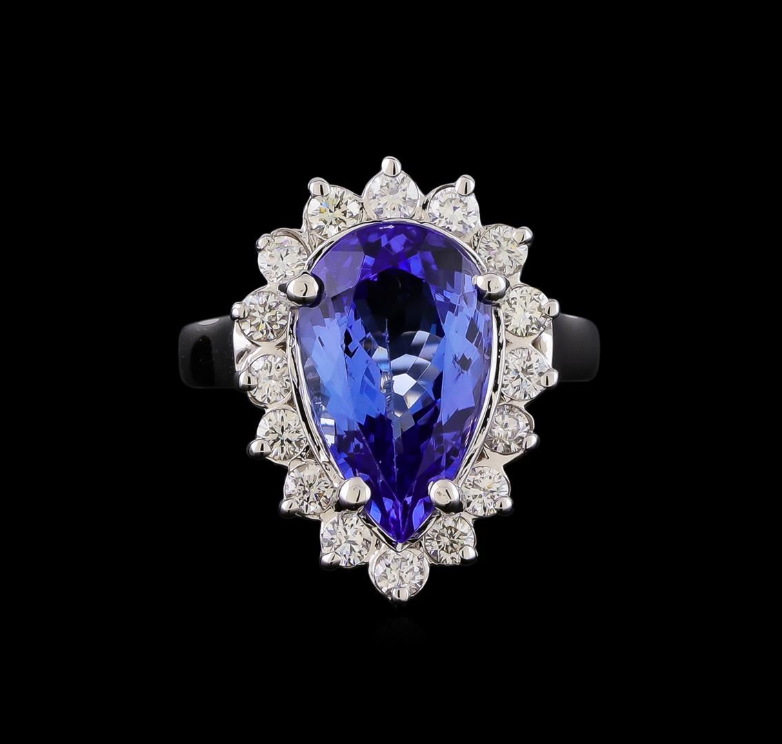 One electronically tested 14KT white gold lady's cast fashion ring with a cathedral basket halo with a bright polish finish. The featured lady's has a shank measuring 2.35 millimeters in width. Identified with markings of "14K". Condition is new, good workmanship. Containing: One prong set pear modified brilliant cut natural tanzanite, measuring 14.59 x 8.82 x 5.73mm, (depth est.) approximate weight of 5.02ct., clarity is eye clean, medium light, moderately strong, bluish violet color, (GIA bV 4/4), cut is very good. Transmitting light with no distortion, transparent. Colored gemstones are presumed to have been subjected to commonly used enhancement processes. Graded in the setting. Sixteen prong set round brilliant cut diamonds, measuring 2.35 - 2.25 x 1.44mm (depth est.) approximate total weight of 16 Stones = 0.76ct. Graded in the setting. Clarity: VS-2 to SI-2. Color: H - I. Cut Good. Total Weight of Colored Stones 5.02ct. Total Weight of Diamonds 0.76ct. Total Weight of Ring 6.60gm. GAS Appraised.