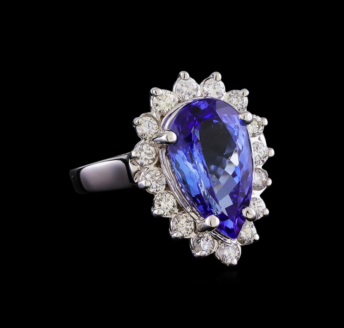 One electronically tested 14KT white gold lady's cast fashion ring with a cathedral basket halo with a bright polish finish. The featured lady's has a shank measuring 2.35 millimeters in width. Identified with markings of "14K". Condition is new, good workmanship. Containing: One prong set pear modified brilliant cut natural tanzanite, measuring 14.59 x 8.82 x 5.73mm, (depth est.) approximate weight of 5.02ct., clarity is eye clean, medium light, moderately strong, bluish violet color, (GIA bV 4/4), cut is very good. Transmitting light with no distortion, transparent. Colored gemstones are presumed to have been subjected to commonly used enhancement processes. Graded in the setting. Sixteen prong set round brilliant cut diamonds, measuring 2.35 - 2.25 x 1.44mm (depth est.) approximate total weight of 16 Stones = 0.76ct. Graded in the setting. Clarity: VS-2 to SI-2. Color: H - I. Cut Good. Total Weight of Colored Stones 5.02ct. Total Weight of Diamonds 0.76ct. Total Weight of Ring 6.60gm. GAS Appraised.