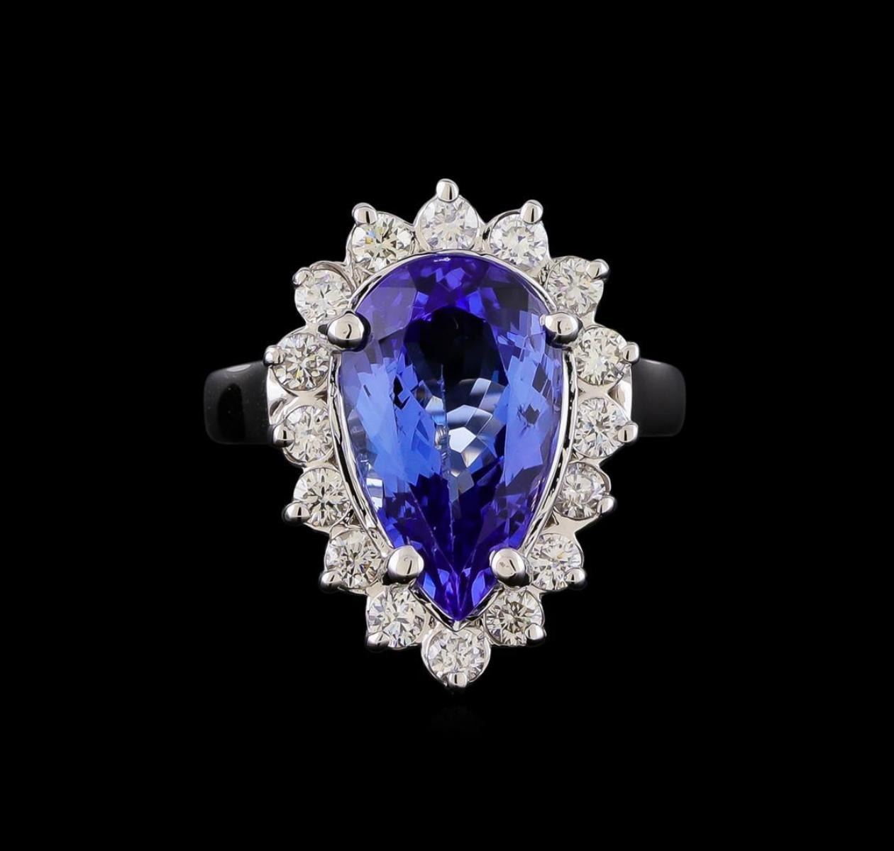 One electronically tested 14KT white gold lady's cast fashion ring with a cathedral basket halo with a bright polish finish. The featured lady's has a shank measuring 2.35 millimeters in width. Identified with markings of "14K". Condition is new, good workmanship. Containing: One prong set pear modified brilliant cut natural tanzanite, measuring 14.59 x 8.82 x 5.73mm, (depth est.) approximate weight of 5.02ct., clarity is eye clean, medium light, moderately strong, bluish violet color, (GIA bV 4/4), cut is very good. Transmitting light with no distortion, transparent. Colored gemstones are presumed to have been subjected to commonly used enhancement processes. Graded in the setting. Sixteen prong set round brilliant cut diamonds, measuring 2.35 - 2.25 x 1.44mm (depth est.) approximate total weight of 16 Stones = 0.76ct. Graded in the setting. Clarity: VS-2 to SI-2. Color: H - I. Cut Good. Total Weight of Colored Stones 5.02ct. Total Weight of Diamonds 0.76ct. Total Weight of Ring 6.60gm.
