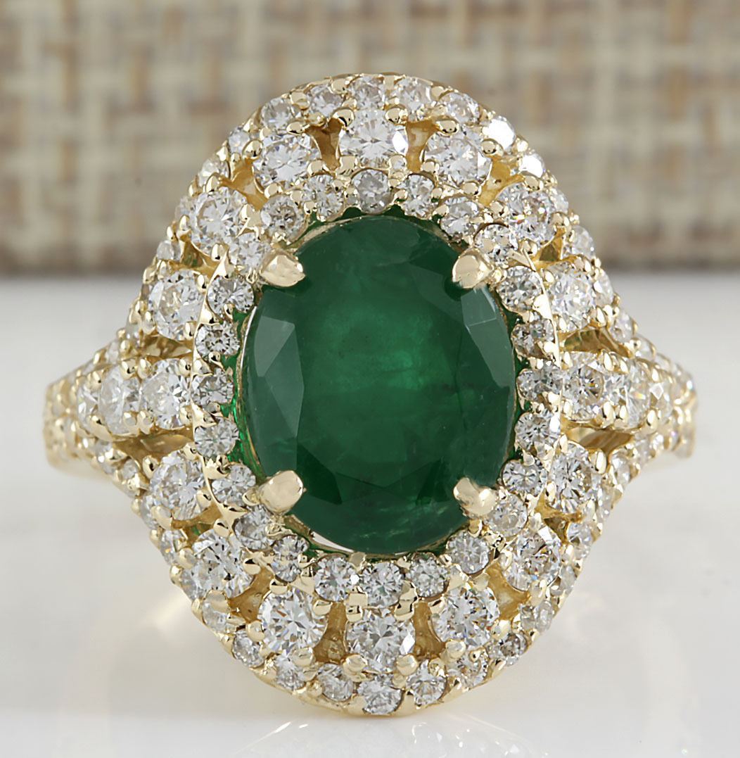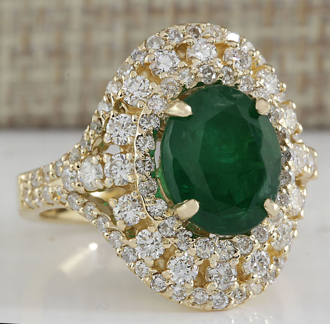 Stamped: 14K Ring Size: 6.75 Total Ring Weight: 8 Grams Diamond Weight: Total natural diamond weight is 1.50carat. SI1-SI2 clarity / G-H color Gemstone Weight: Total Natural Emerald Weight is 3.52ctw (Measures: 10.35x8.30mm) High End Gemstone Face Measures: 20.00x18.20mm Main stone color: Green [SKU:702674]