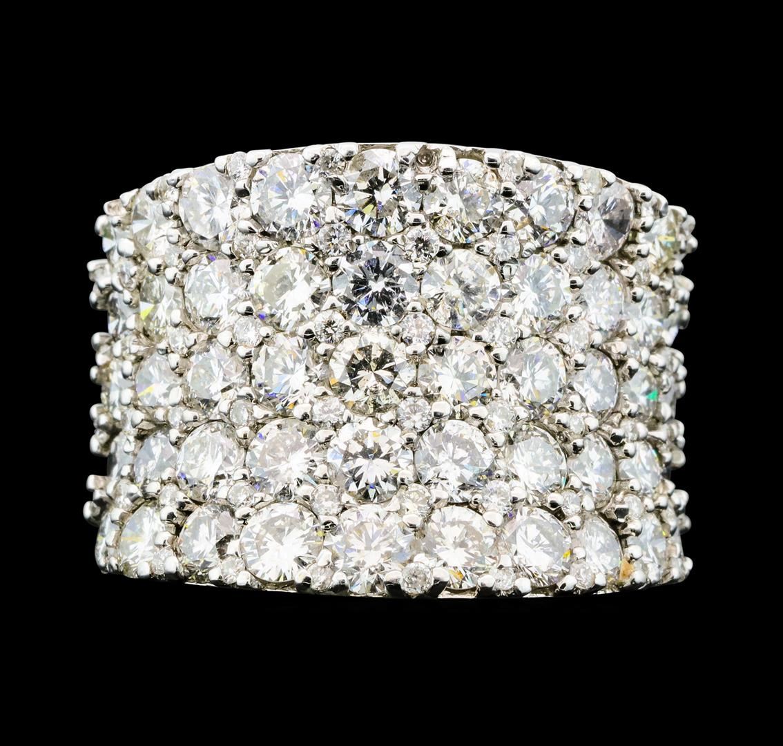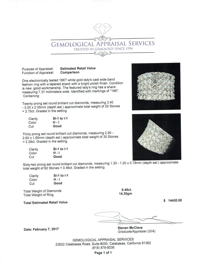 One electronically tested 18KT white gold lady's cast wide band fashion ring with a tapered shank with a bright polish finish. The featured lady's ring has a shank measuring 7.37 millimeters wide. Identified with markings of '18K'. Condition is new, good workmanship. Containing: Twenty prong set round brilliant cut diamonds, measuring 3.40 - 3.20 x 2.05mm (depth est.) approximate total weight of 20 Stones = 2.75ct. Graded in the setting. Clarity SI-1 to I-1. Color: H - I Cut Good Thirty prong set round brilliant cut diamonds, measuring 2.90 - 2.60 x 1.65mm (depth est.) approximate total weight of 30 Stones = 2.28ct. Graded in the setting. Clarity SI-1 to I-1. Color: H - I Cut Good Sixty-Two prong set round brilliant cut diamonds, measuring 1.30 - 1.20 x 0.78mm (depth est.) approximate total weight of 62 Stones = 0.46ct. Graded in the setting. Clarity SI-1 to I-1. Color: H - I Cut Good. Total Weight of Diamonds 5.49ct.. Total Weight of Ring 14.30gm GAS Appraised at $14,430.00.