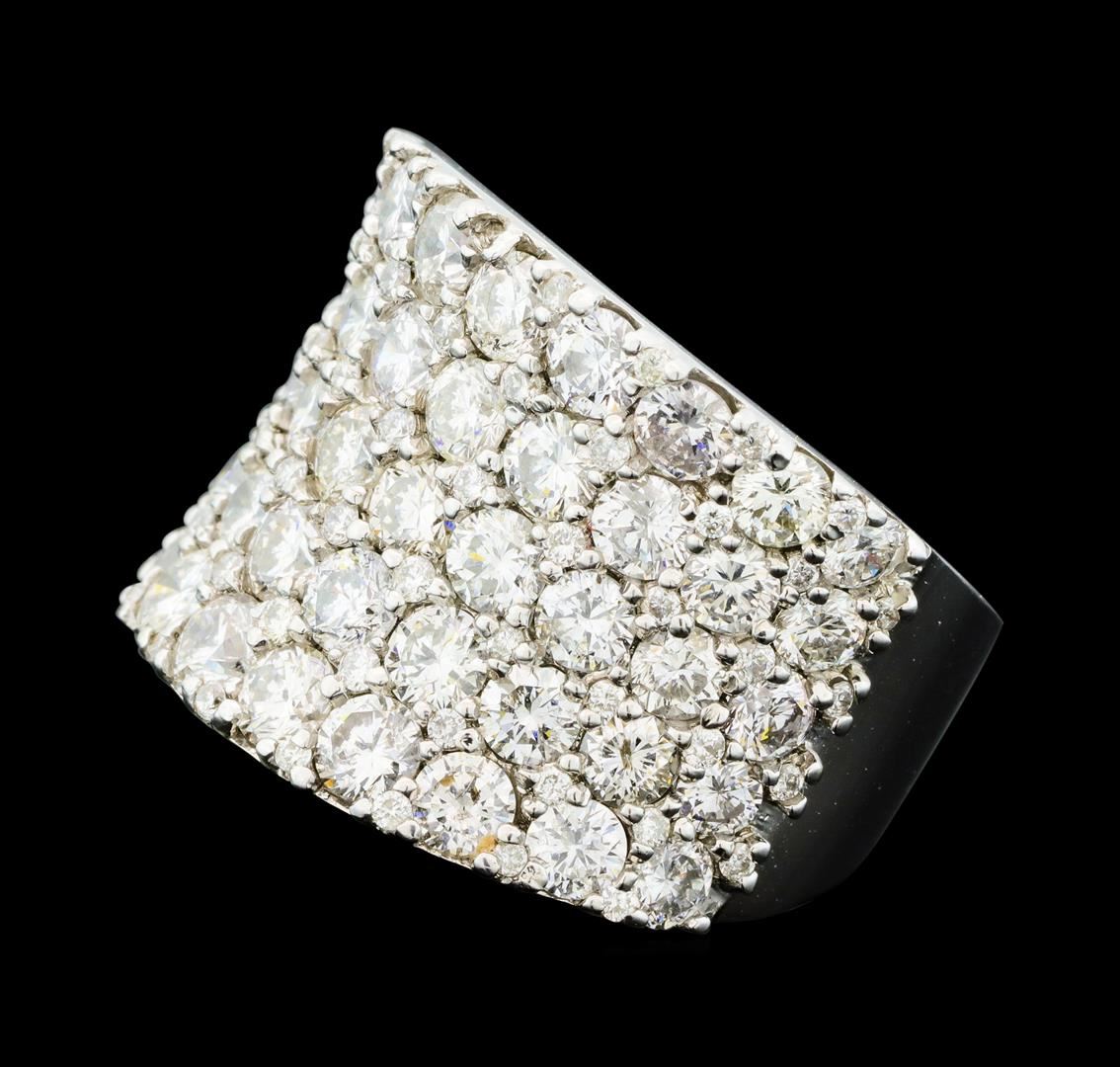 One electronically tested 18KT white gold lady's cast wide band fashion ring with a tapered shank with a bright polish finish. The featured lady's ring has a shank measuring 7.37 millimeters wide. Identified with markings of '18K'. Condition is new, good workmanship. Containing: Twenty prong set round brilliant cut diamonds, measuring 3.40 - 3.20 x 2.05mm (depth est.) approximate total weight of 20 Stones = 2.75ct. Graded in the setting. Clarity SI-1 to I-1. Color: H - I Cut Good Thirty prong set round brilliant cut diamonds, measuring 2.90 - 2.60 x 1.65mm (depth est.) approximate total weight of 30 Stones = 2.28ct. Graded in the setting. Clarity SI-1 to I-1. Color: H - I Cut Good Sixty-Two prong set round brilliant cut diamonds, measuring 1.30 - 1.20 x 0.78mm (depth est.) approximate total weight of 62 Stones = 0.46ct. Graded in the setting. Clarity SI-1 to I-1. Color: H - I Cut Good. Total Weight of Diamonds 5.49ct.. Total Weight of Ring 14.30gm GAS Appraised at $14,430.00.