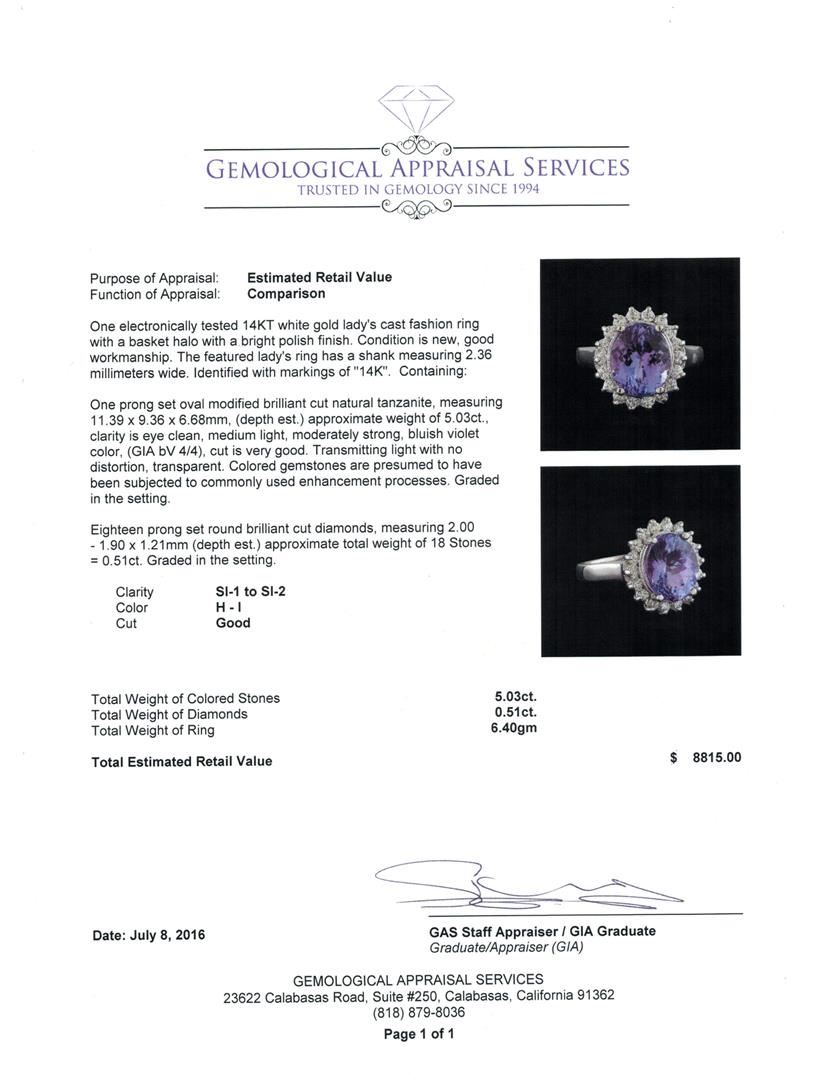 One electronically tested 14KT white gold lady's cast fashion ring with a basket halo with a bright polish finish. The featured lady's ring has a shank measuring 2.36 millimeters wide. Identified with markings of "14K". Condition is new, good workmanship. Containing: One prong set oval modified brilliant cut natural tanzanite, measuring 11.39 x 9.36 x 6.68mm, (depth est.) approximate weight of 5.03ct., clarity is eye clean, medium light, moderately strong, bluish violet color, (GIA bV 4/4), cut is very good. Transmitting light with no distortion, transparent. Colored gemstones are presumed to have been subjected to commonly used enhancement processes. Graded in the setting. Eighteen prong set round brilliant cut diamonds, measuring 2.00 - 1.90 x 1.21mm (depth est.) approximate total weight of 18 Stones = 0.51ct. Graded in the setting. Clarity: SI-1 to SI-2. Color: H - I. Cut Good. Total Weight of Colored Stones 5.03ct. Total Weight of Diamonds 0.51ct. Total Weight of Ring 6.40gm. GAS Appraised at $8,815.00.