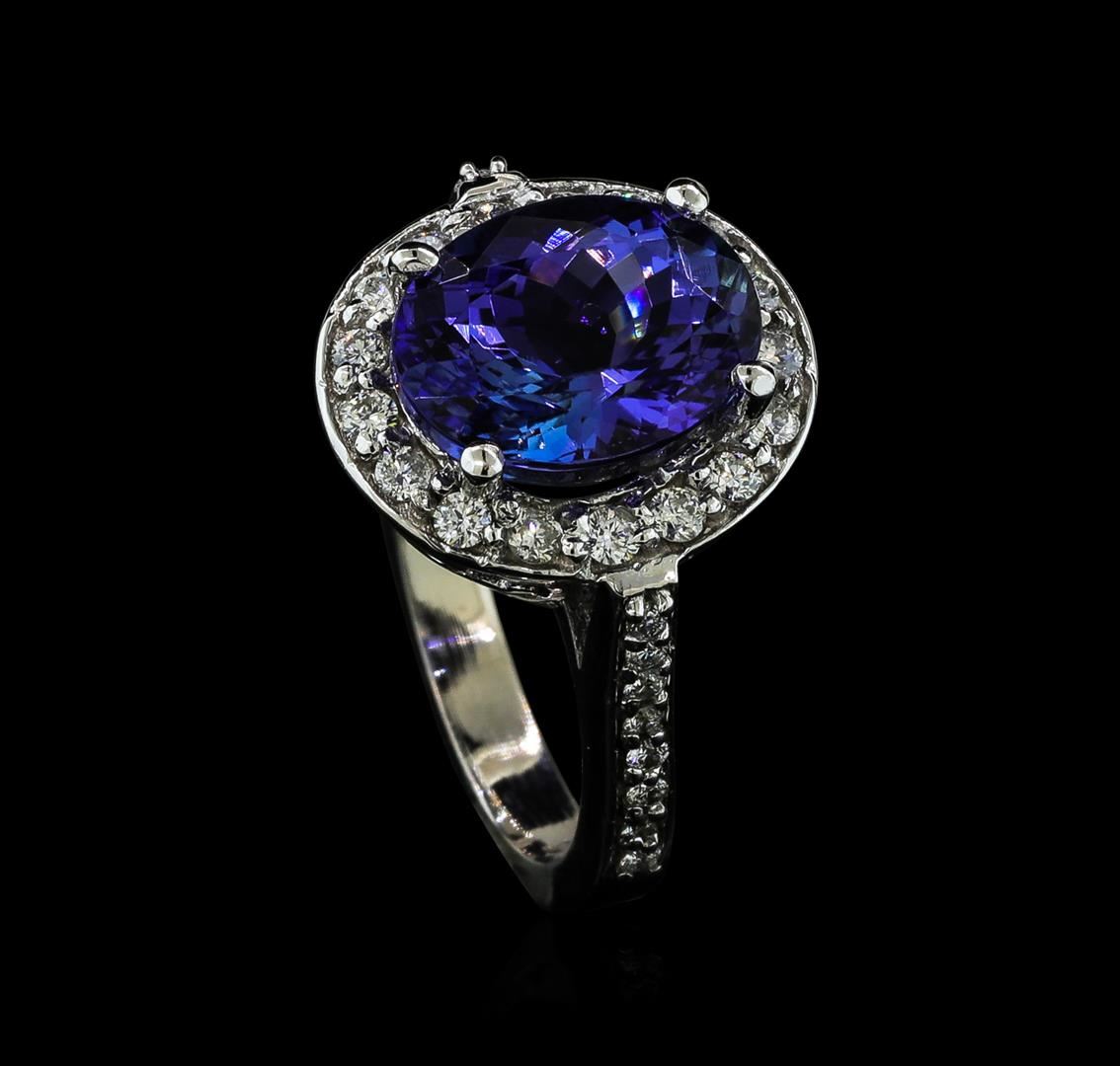 One electronically tested 14KT white gold lady's cast fashion ring with a cathedral halo with a bright polish finish. The featured lady's ring has a shank measuring 2.73 millimeters wide. Identified with markings of '14K'. Condition is new, good workmanship. Containing: One prong set oval modified brilliant cut natural tanzanite, measuring 11.39 x 8.89 x 6.86mm, (depth est.) 3%. bulge factor, approximate weight of 5.03ct., clarity is eye clean, medium dark, moderately strong, violetish blue color, (GIA vB 6/4), cut is very good. Transmitting light with no distortion, transparent. Colored gemstones are presumed to have been subjected to commonly used enhancement processes. Graded in the setting. Seventeen prong set round brilliant cut diamonds, measuring 1.80 - 1.70 x 1.09mm (depth est.) approximate total weight of 17 Stones = 0.35ct. Graded in the setting. Clarity SI-1 to I-1. Color: G - H Cut Good Sixteen prong set round brilliant cut diamonds, measuring 1.40 - 1.35 x 0.86mm (depth est.) approximate total weight of 16 Stones = 0.16ct. Graded in the setting. Clarity SI-1 to I-1. Color: H - I Cut Good. Total Weight of Colored Stones 5.03ct.. Total Weight of Diamonds 0.51ct.. Total Weight of Ring 7.30gm GAS Appraised at $11,090.00.