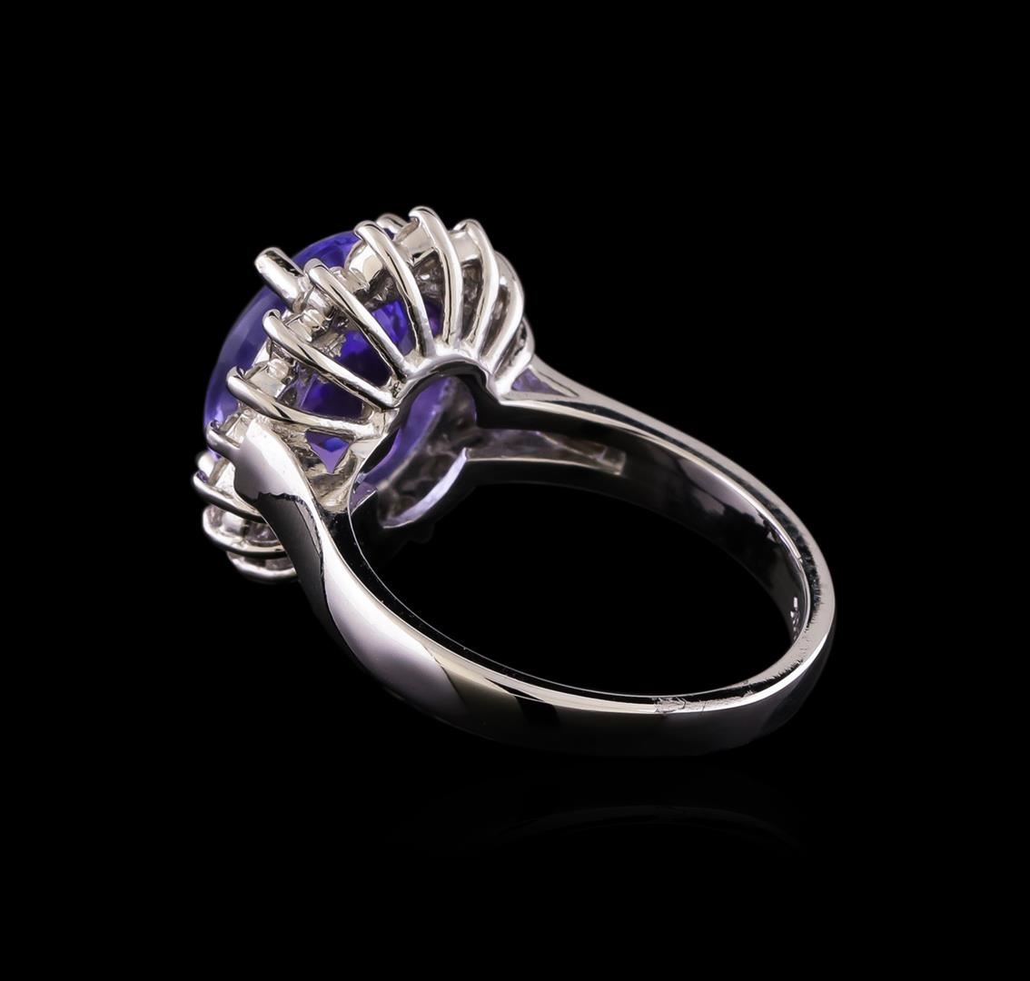 One electronically tested 14KT white gold lady's cast fashion ring with a basket halo with a bright polish finish. The featured lady's ring has a shank measuring 2.36 millimeters wide. Identified with markings of "14K". Condition is new, good workmanship. Containing: One prong set oval modified brilliant cut natural tanzanite, measuring 11.39 x 9.36 x 6.68mm, (depth est.) approximate weight of 5.03ct., clarity is eye clean, medium light, moderately strong, bluish violet color, (GIA bV 4/4), cut is very good. Transmitting light with no distortion, transparent. Colored gemstones are presumed to have been subjected to commonly used enhancement processes. Graded in the setting. Eighteen prong set round brilliant cut diamonds, measuring 2.00 - 1.90 x 1.21mm (depth est.) approximate total weight of 18 Stones = 0.51ct. Graded in the setting. Clarity: SI-1 to SI-2. Color: H - I. Cut Good. Total Weight of Colored Stones 5.03ct. Total Weight of Diamonds 0.51ct. Total Weight of Ring 6.40gm.