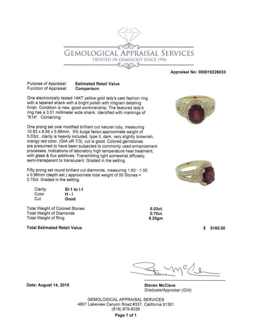 One electronically tested 14KT yellow gold lady's cast fashion ring with a tapered shank with a bright polish with milgrain detailing finish. The featured lady's ring has a 3.51 millimeter wide shank. Identified with markings of "K14". Condition is new, good workmanship. Containing: One prong set oval modified brilliant cut natural ruby, measuring 10.83 x 8.95 x 5.89mm, 5% bulge factor, approximate weight of 5.03ct., clarity is heavily included, type II, dark, very slightly brownish, orangy red color, (GIA oR 7/3), cut is good. Colored gemstones are presumed to have been subjected to commonly used enhancement processes. Indications of laboratory high temperature heat treatment, with glass & flux additives. Transmitting light somewhat diffusely, semi-transparent to translucent. Graded in the setting. Fifty prong set round brilliant cut diamonds, measuring 1.60 - 1.50 x 0.96mm (depth est.) approximate total weight of 50 Stones = 0.70ct. Graded in the setting. Clarity: SI-1 to I-1. Color: H - I. Cut Good. Total Weight of Colored Stones 5.03ct. Total Weight of Diamonds 0.70ct. Total Weight of Ring 8.20gm. GAS Appraised at $5,165.00.