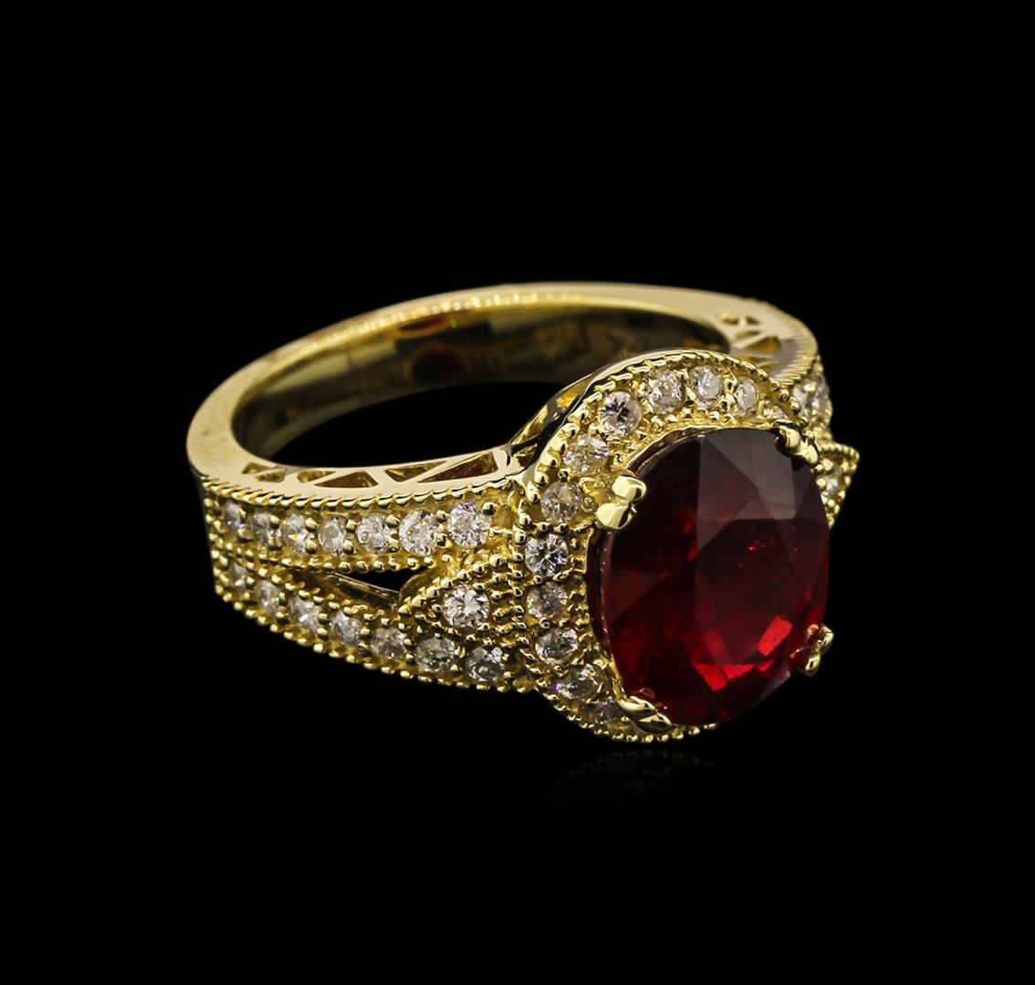 One electronically tested 14KT yellow gold lady's cast fashion ring with a tapered shank with a bright polish with milgrain detailing finish. The featured lady's ring has a 3.51 millimeter wide shank. Identified with markings of "K14". Condition is new, good workmanship. Containing: One prong set oval modified brilliant cut natural ruby, measuring 10.83 x 8.95 x 5.89mm, 5% bulge factor, approximate weight of 5.03ct., clarity is heavily included, type II, dark, very slightly brownish, orangy red color, (GIA oR 7/3), cut is good. Colored gemstones are presumed to have been subjected to commonly used enhancement processes. Indications of laboratory high temperature heat treatment, with glass & flux additives. Transmitting light somewhat diffusely, semi-transparent to translucent. Graded in the setting. Fifty prong set round brilliant cut diamonds, measuring 1.60 - 1.50 x 0.96mm (depth est.) approximate total weight of 50 Stones = 0.70ct. Graded in the setting. Clarity: SI-1 to I-1. Color: H - I. Cut Good. Total Weight of Colored Stones 5.03ct. Total Weight of Diamonds 0.70ct. Total Weight of Ring 8.20gm. GAS Appraised at $5,165.00.
