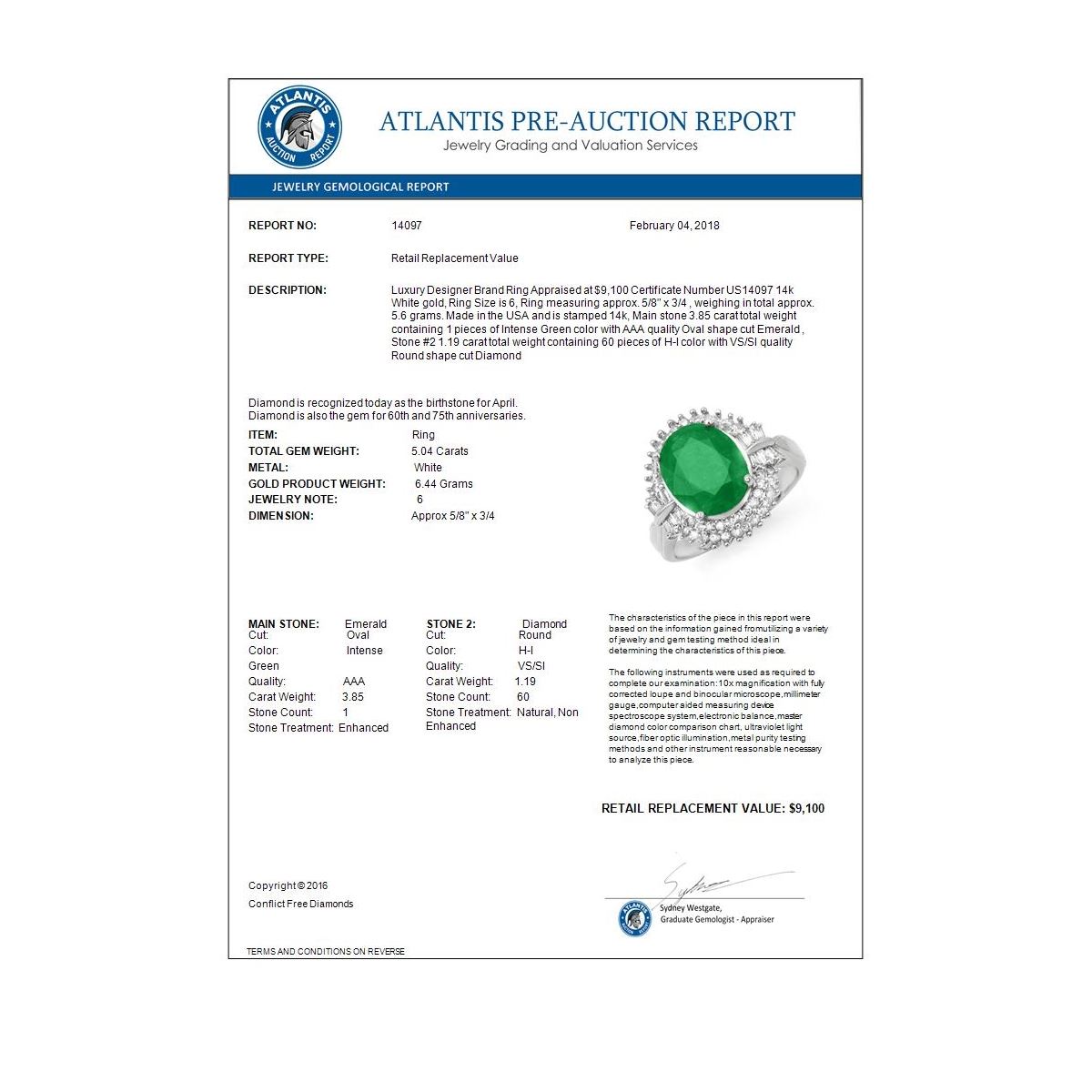 REF-127W3F -14097 ---- 5.04 CTW Emerald & Diamond Ring 14K White Gold ---- Luxury Designer Brand Ring Appraised at $9,100 Certificate Number US14097 14k White gold, Ring Size is 6, Ring measuring approx. 5/8" x 3/4 , weighing in total approx. 5.6 grams. Made in the USA and is stamped 14k, Main stone 3.85 carat total weight containing 1 pieces of Intense Green color with AAA quality Oval shape cut Emerald , Stone #2 1.19 carat total weight containing 60 pieces of H-I color with VS/SI quality Round shape cut Diamond